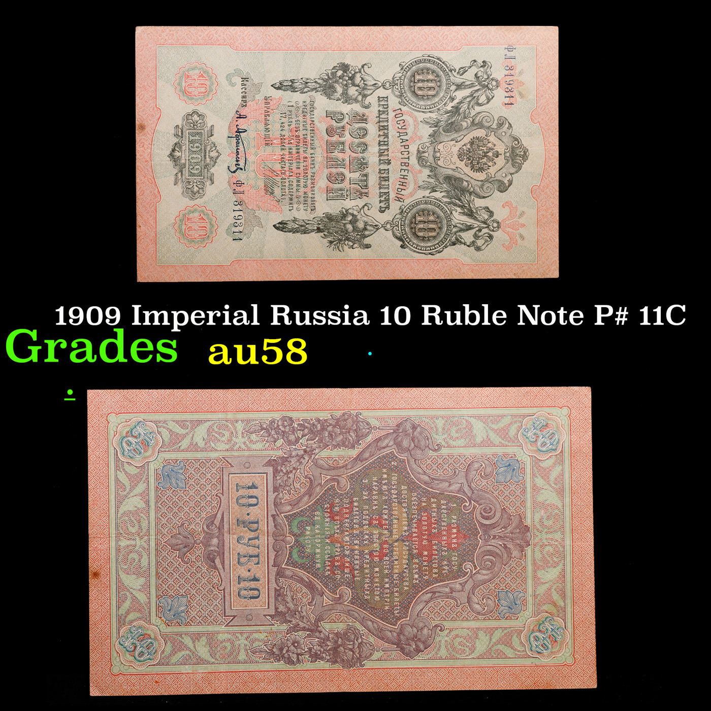1909 Imperial Russia 10 Ruble Note P# 11C Grades Choice AU/BU Slider. Up for auction we have a beautiful, ornate Imperial Ruble note from the final decade of the Russian Empire under Tsar Nicholas II, which managed to survive through the Russian Revolution and Civil War. These notes became relatively useless in the early Soviet period, due to hyperinflation and other factors, and many were lost or destroyed.