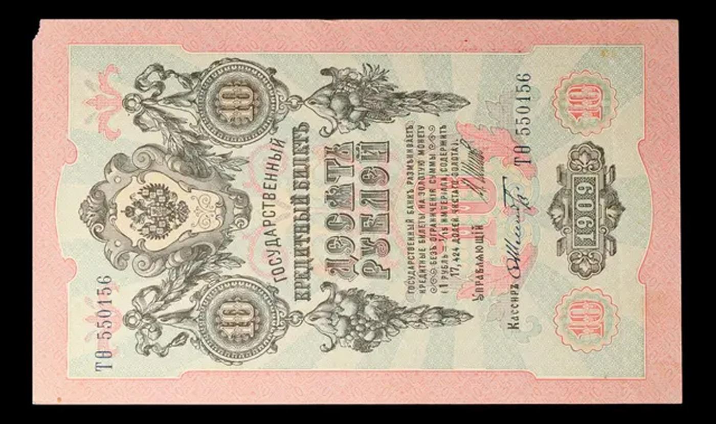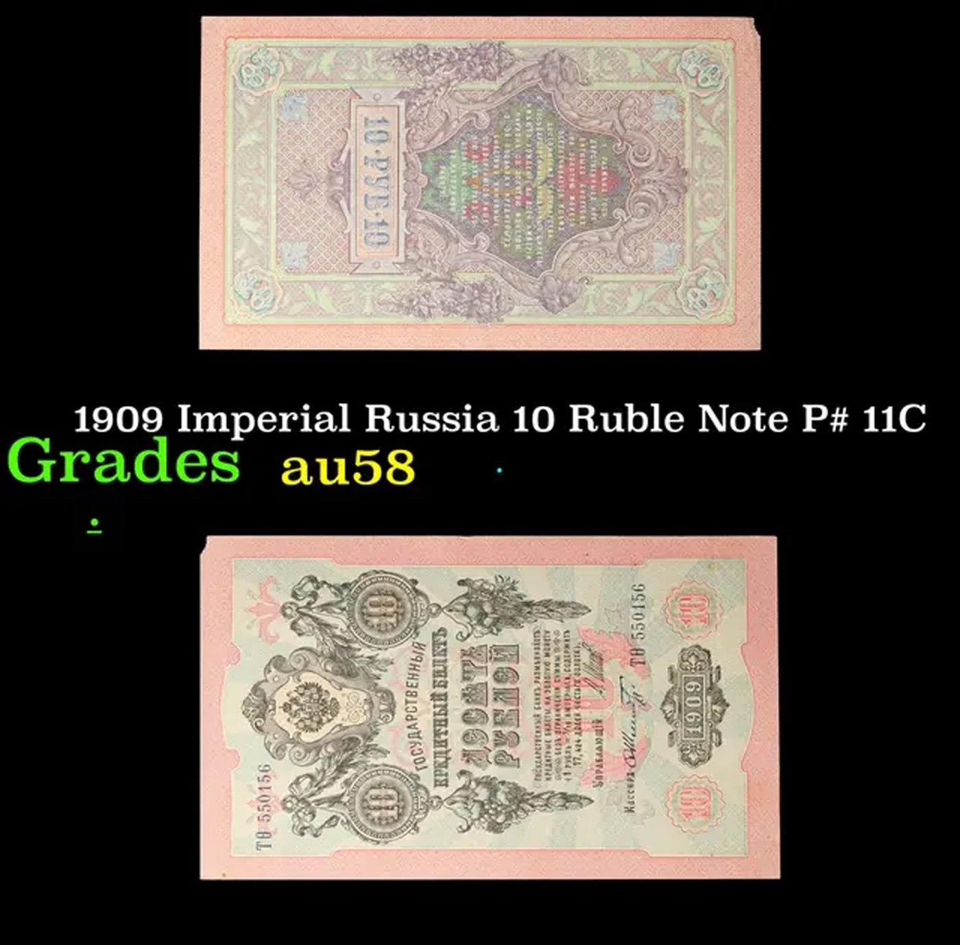 1909 Imperial Russia 10 Ruble Note P# 11C Grades Choice AU/BU Slider. Up for auction we have a beautiful, ornate Imperial Ruble note from the final decade of the Russian Empire under Tsar Nicholas II, which managed to survive through the Russian Revolution and Civil War. These notes became relatively useless in the early Soviet period, due to hyperinflation and other factors, and many were lost or destroyed.