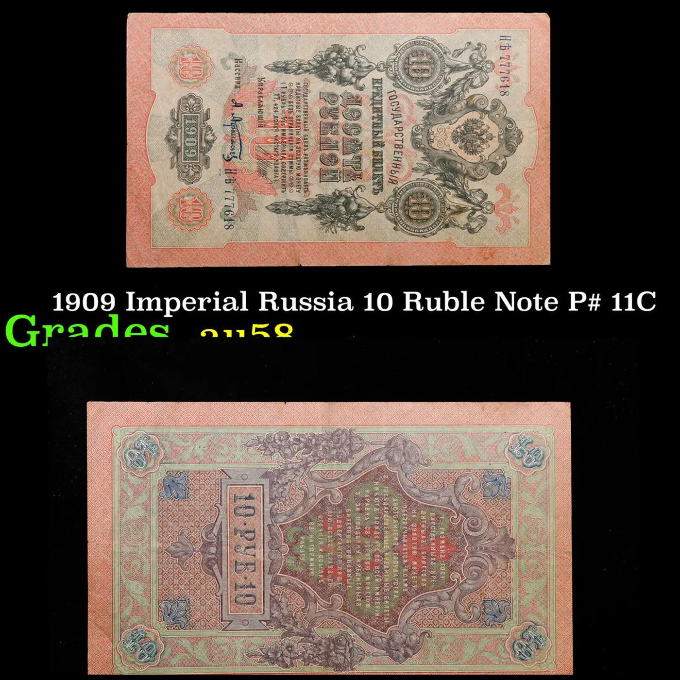 1909 Imperial Russia 10 Ruble Note P# 11C Grades Choice AU/BU Slider. Up for auction we have a beautiful, ornate Imperial Ruble note from the final decade of the Russian Empire under Tsar Nicholas II, which managed to survive through the Russian Revolution and Civil War. These notes became relatively useless in the early Soviet period, due to hyperinflation and other factors, and many were lost or destroyed.