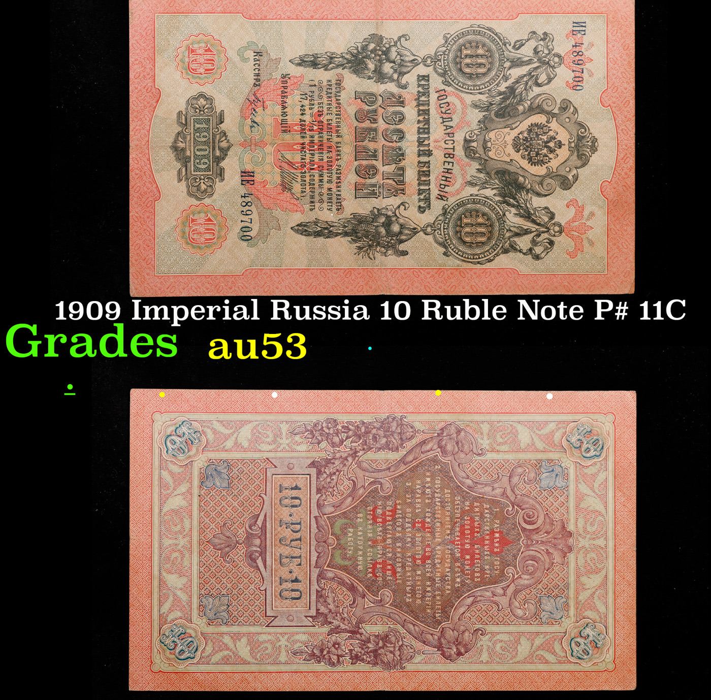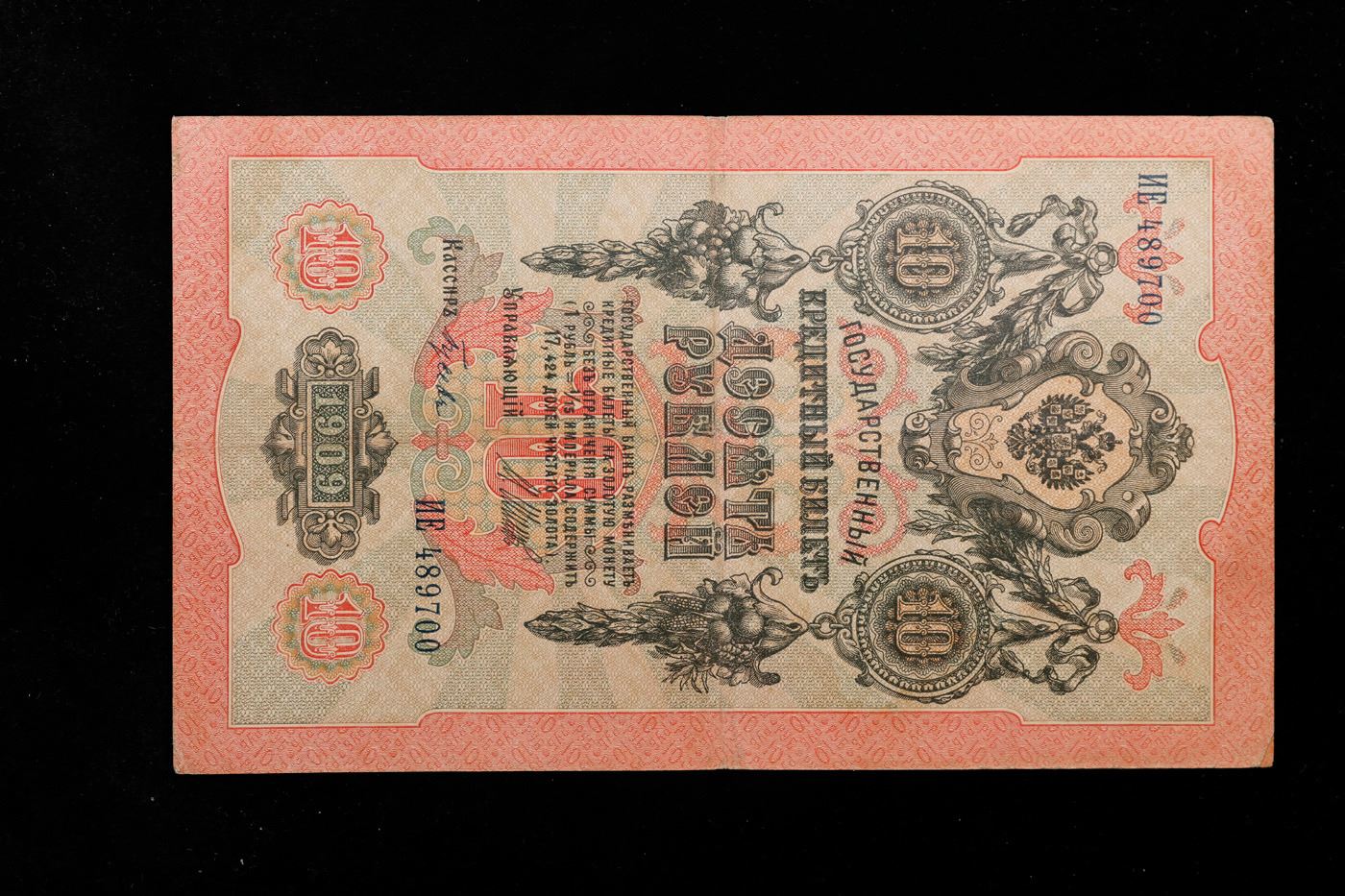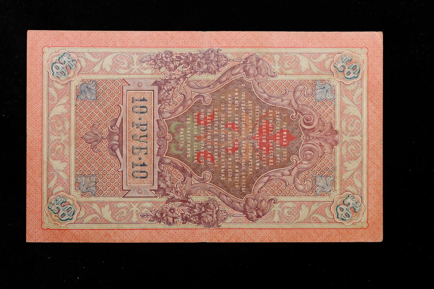 1909 Imperial Russia 10 Ruble Note P# 11C Grades Select AU. Up for auction we have a beautiful, ornate Imperial Ruble note from the final decade of the Russian Empire under Tsar Nicholas II, which managed to survive through the Russian Revolution and Civil War. These notes became relatively useless in the early Soviet period, due to hyperinflation and other factors, and many were lost or destroyed.