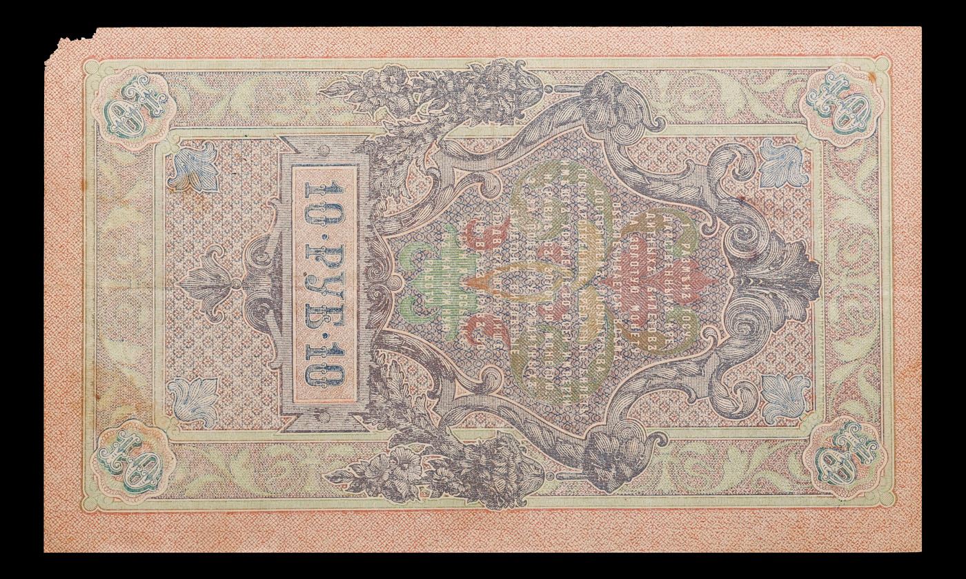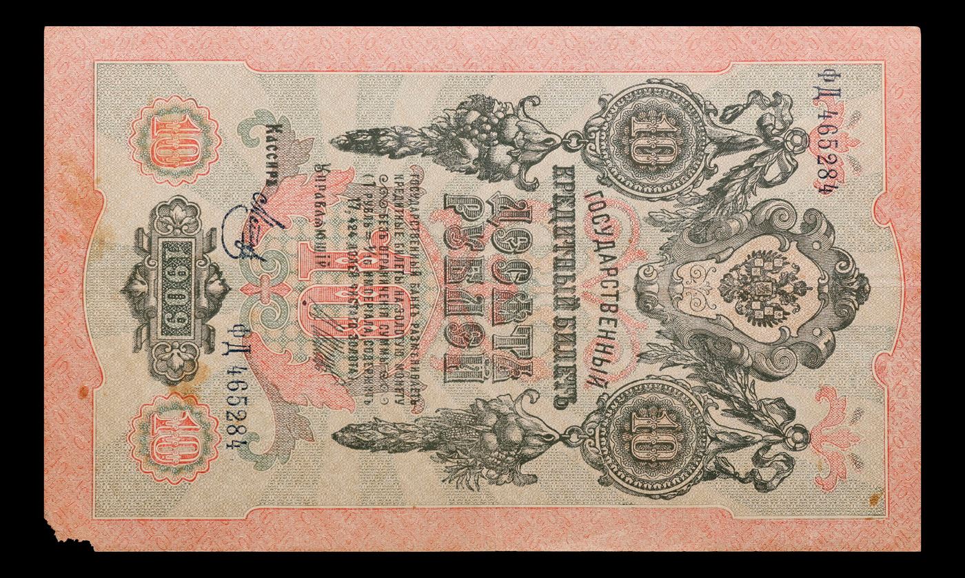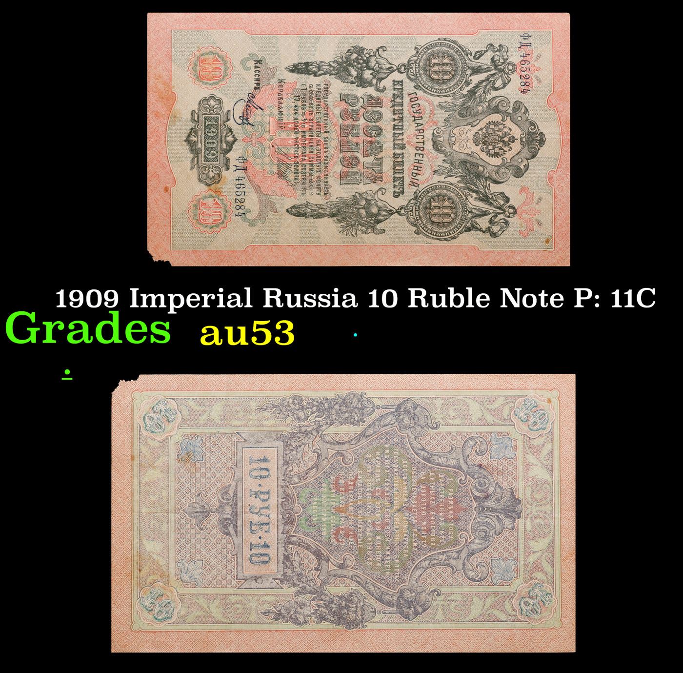 1909 Imperial Russia 10 Ruble Note P: 11C Grades Select AU. The 25 Ruble note was very slightly larger than the 5 and 10 Rubles notes of the same issue, and differed quite a bit in visual design. The reverse featured a portrait of Tsar Alexander II, whereas the smaller bills featured no portraiture.