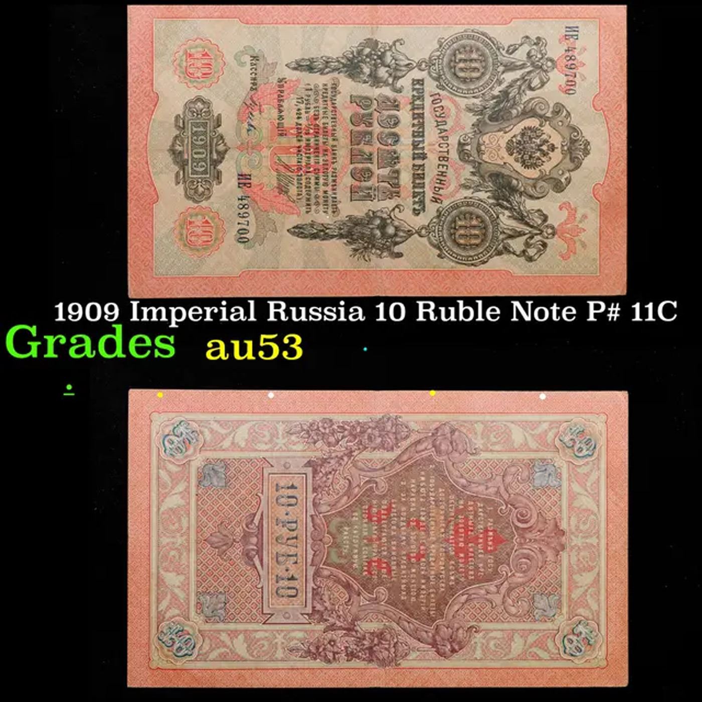 1909 Imperial Russia 10 Ruble Note P# 11C Grades Select AU. Up for auction we have a beautiful, ornate Imperial Ruble note from the final decade of the Russian Empire under Tsar Nicholas II, which managed to survive through the Russian Revolution and Civil War. These notes became relatively useless in the early Soviet period, due to hyperinflation and other factors, and many were lost or destroyed.