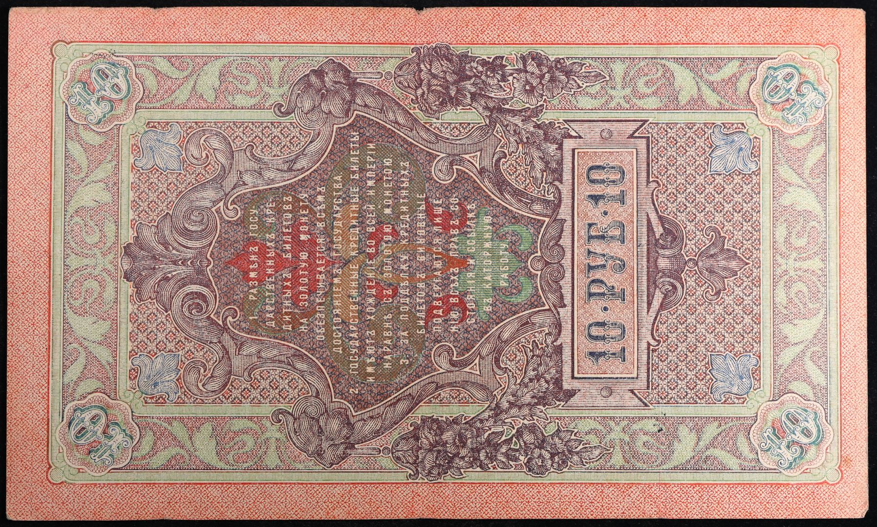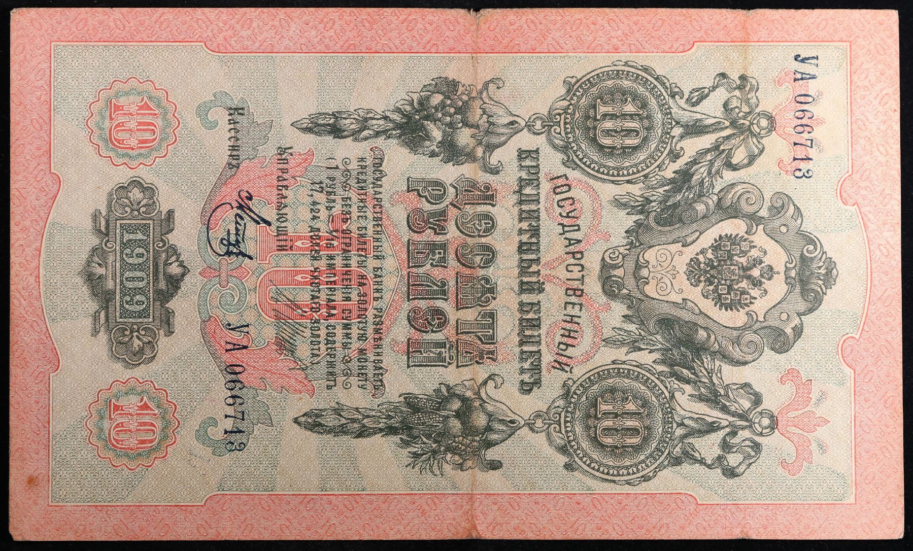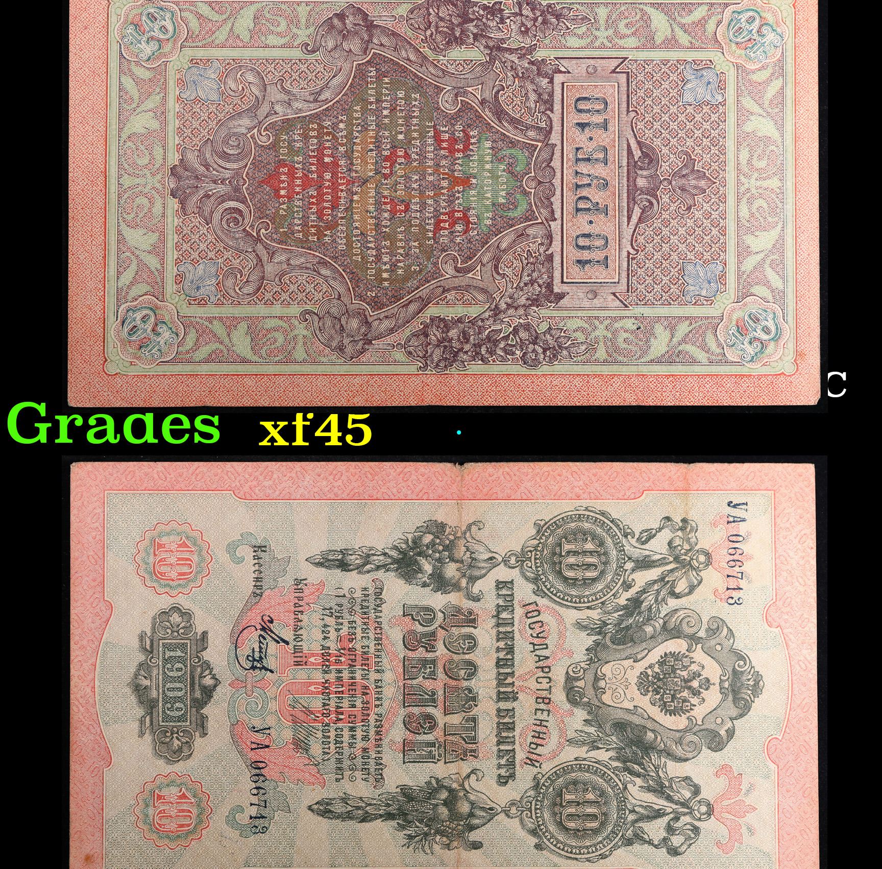 1909 Imperial Russia 10 Ruble Note P: 11C Grades xf+.