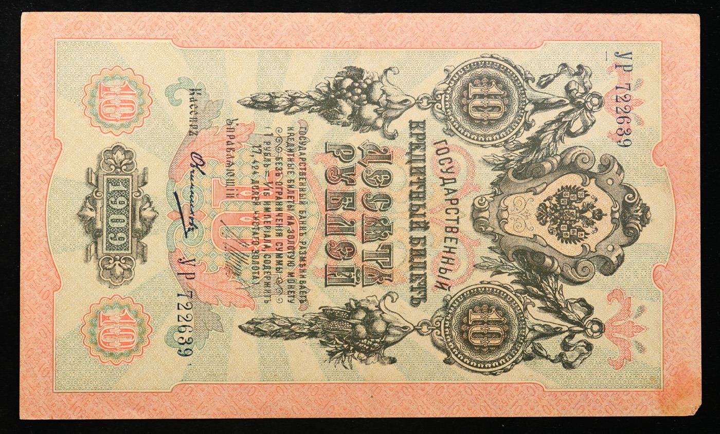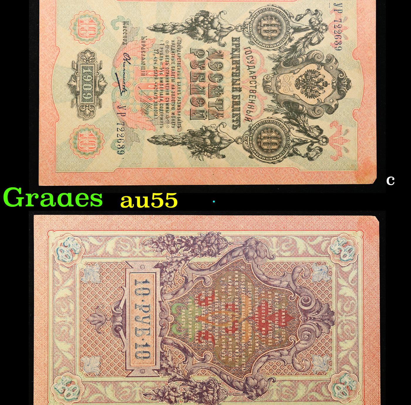 1909 Imperial Russia 10 Ruble Note P# 11c Grades Choice AU.