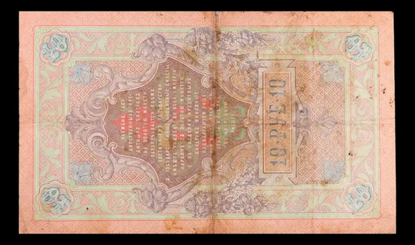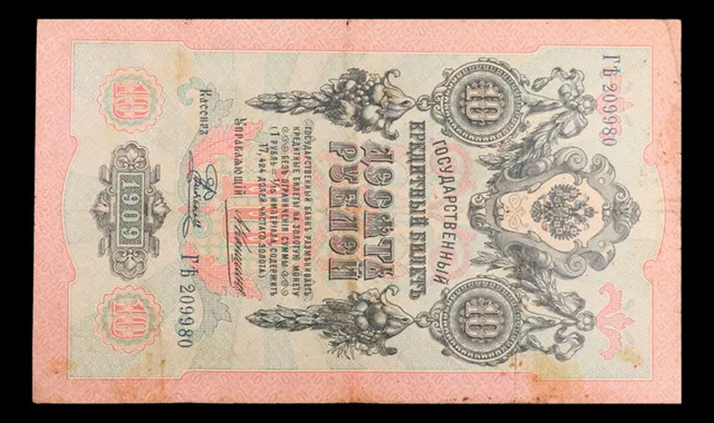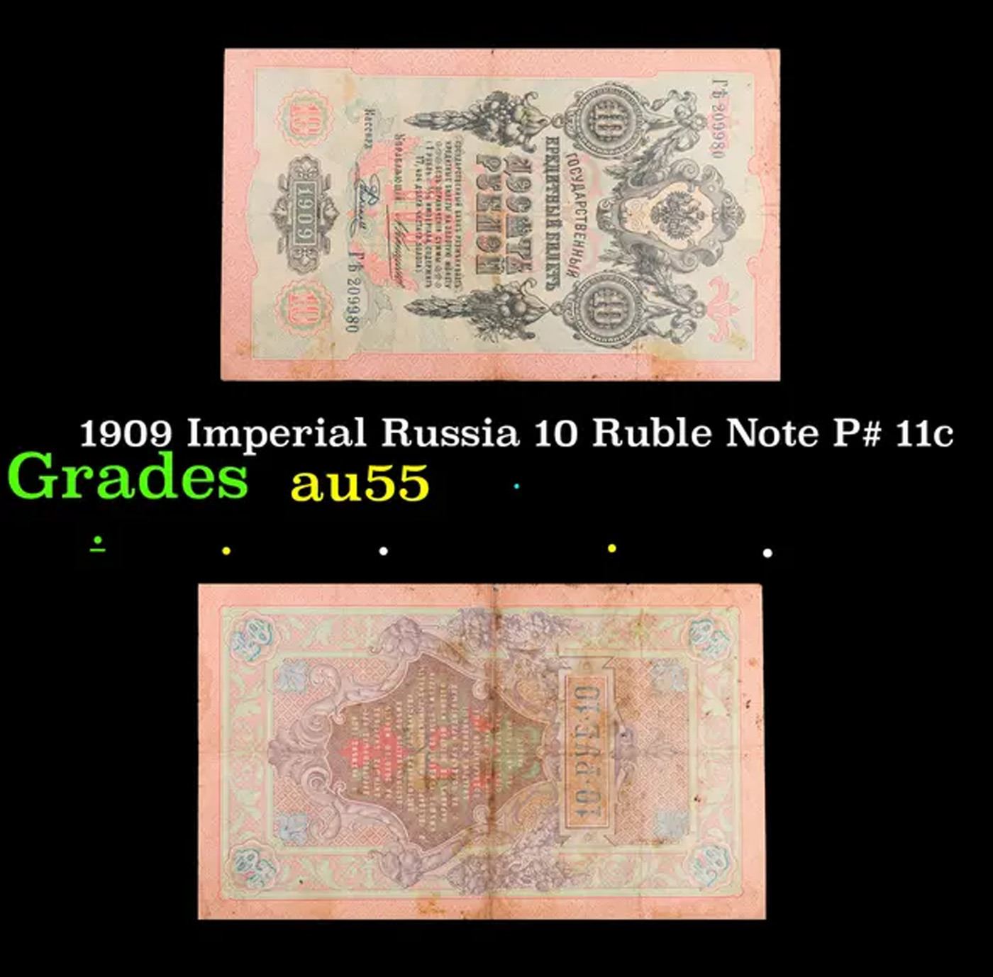 1909 Imperial Russia 10 Ruble Note P# 11c Grades Choice AU. Up for auction we have a beautiful, ornate Imperial Ruble note from the final decade of the Russian Empire under Tsar Nicholas II, which managed to survive through the Russian Revolution and Civil War. These notes became relatively useless in the early Soviet period, due to hyperinflation and other factors, and many were lost or destroyed.