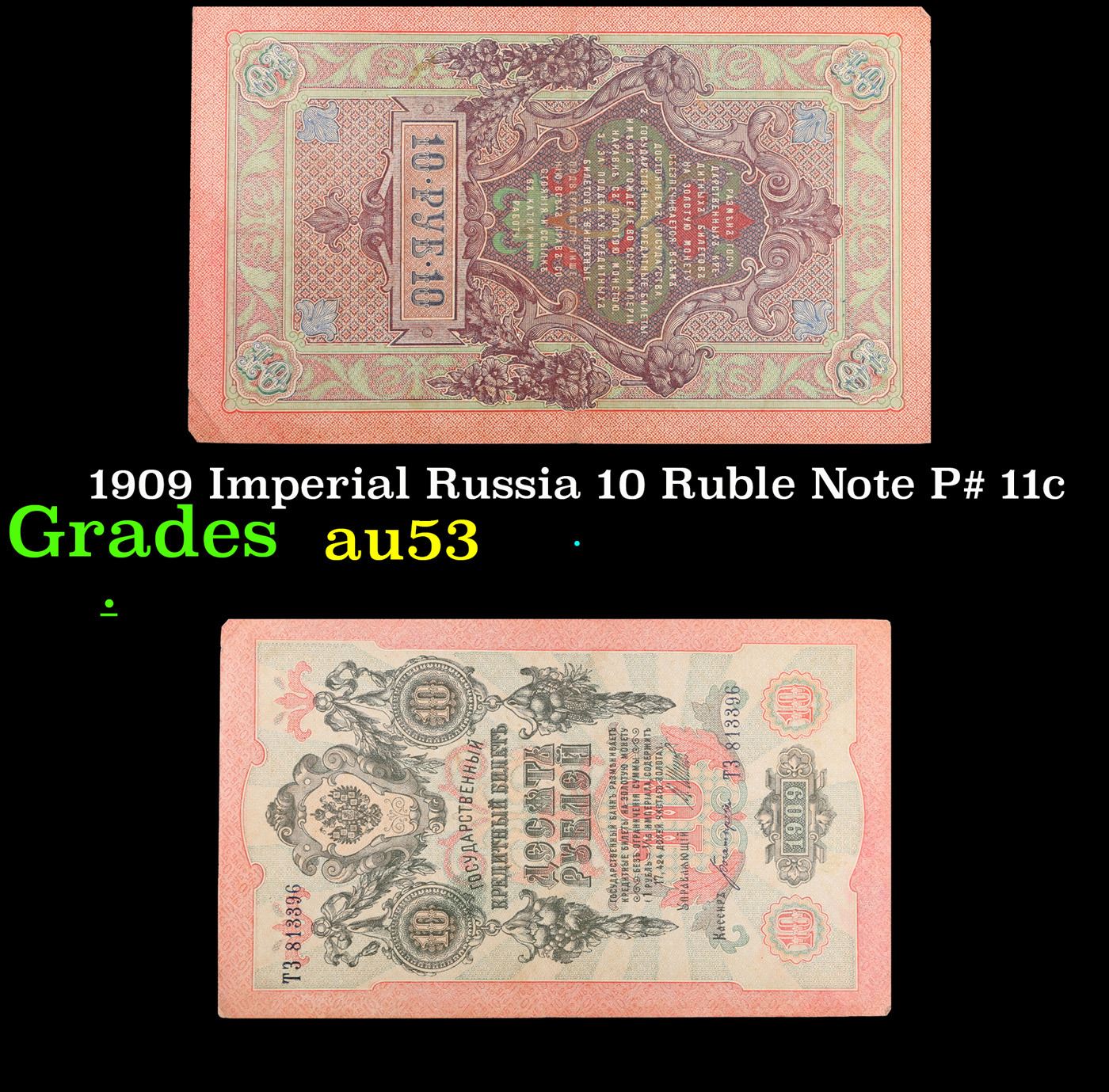 1909 Imperial Russia 10 Ruble Note P# 11c Grades Select AU. Up for auction we have a beautiful, ornate Imperial Ruble note from the final decade of the Russian Empire under Tsar Nicholas II, which managed to survive through the Russian Revolution and Civil War. These notes became relatively useless in the early Soviet period, due to hyperinflation and other factors, and many were lost or destroyed.