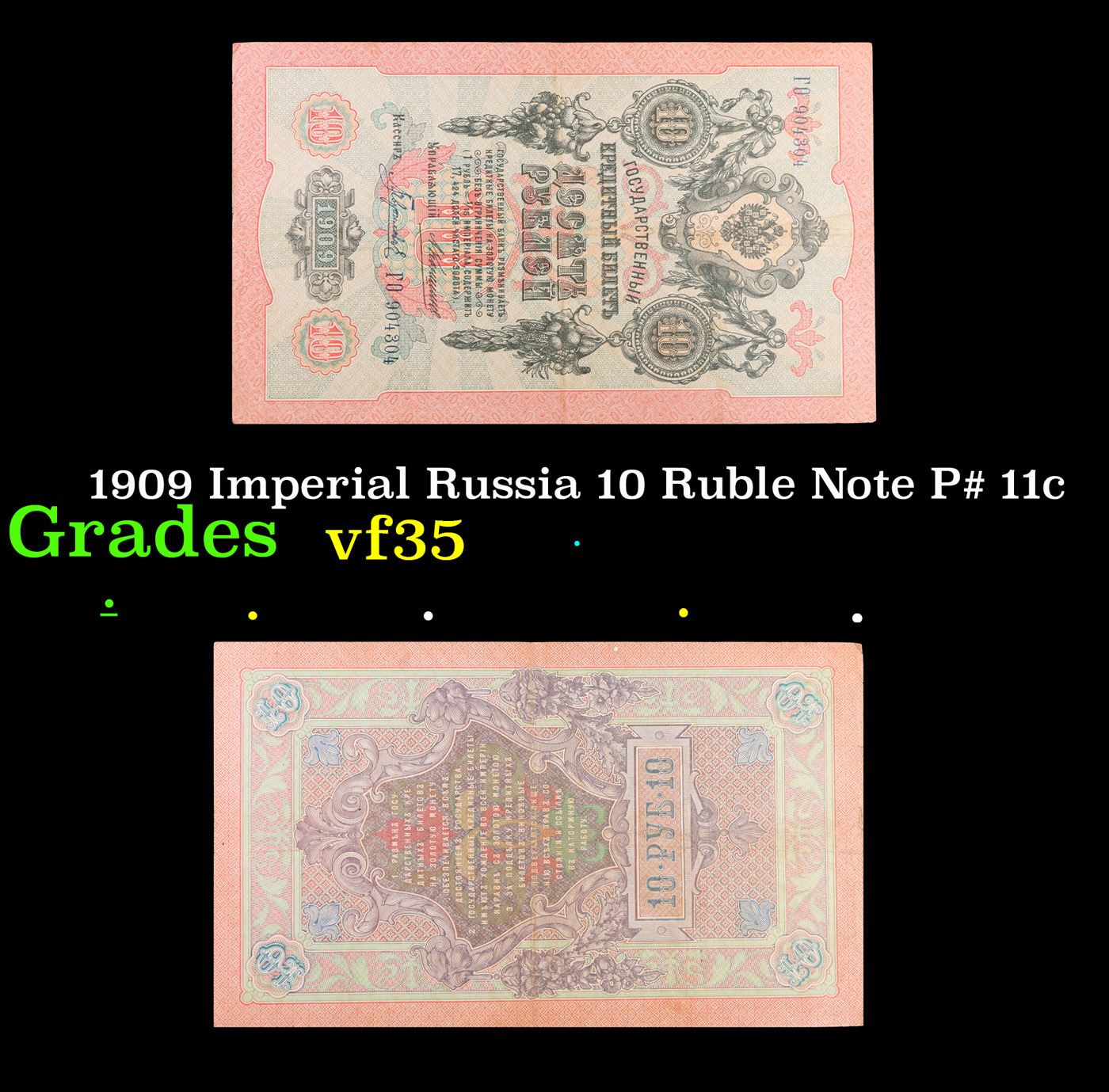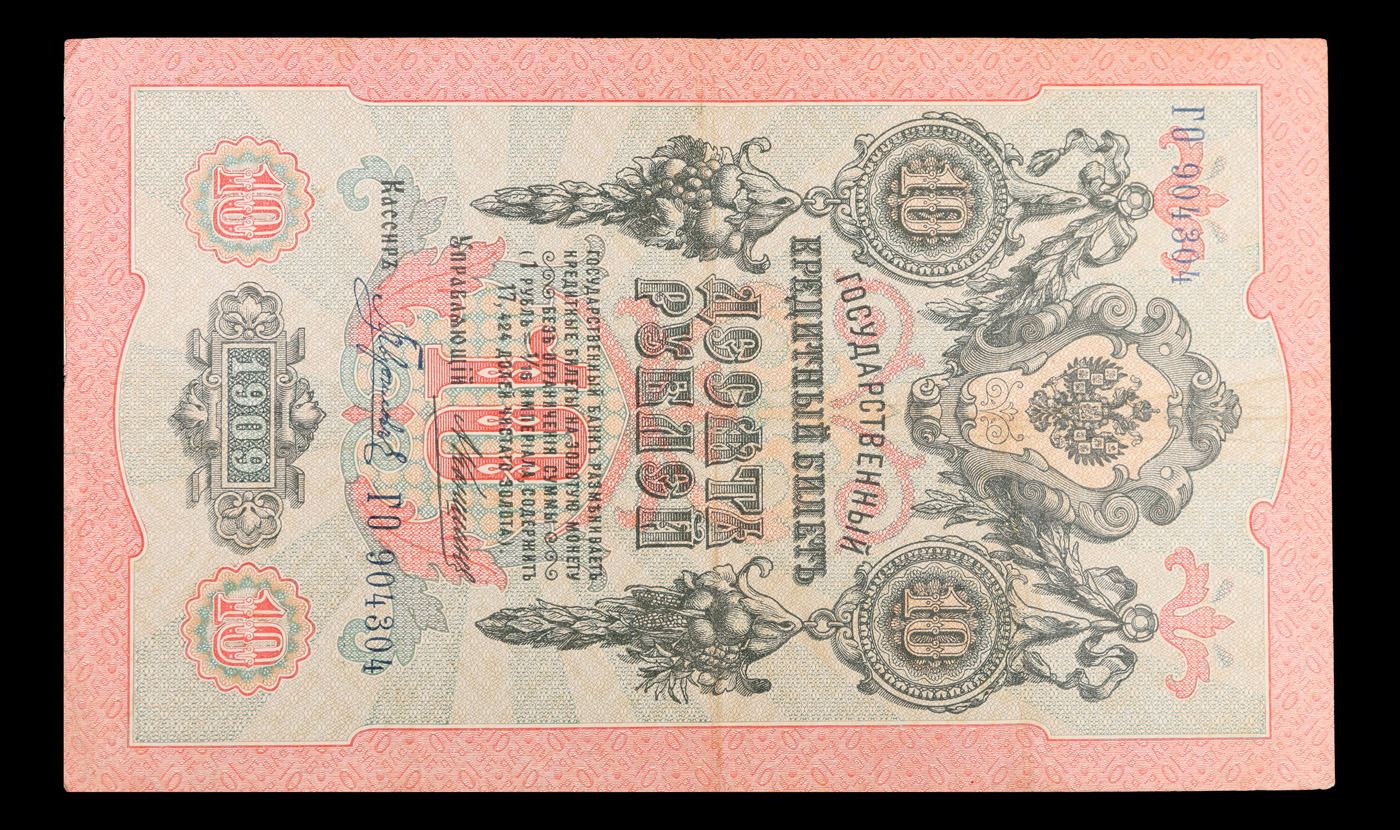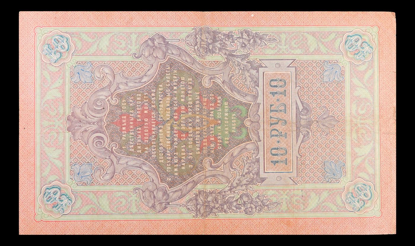 1909 Imperial Russia 10 Ruble Note P# 11c Grades vf++. Up for auction we have a beautiful, ornate Imperial Ruble note from the final decade of the Russian Empire under Tsar Nicholas II, which managed to survive through the Russian Revolution and Civil War. These notes became relatively useless in the early Soviet period, due to hyperinflation and other factors, and many were lost or destroyed.