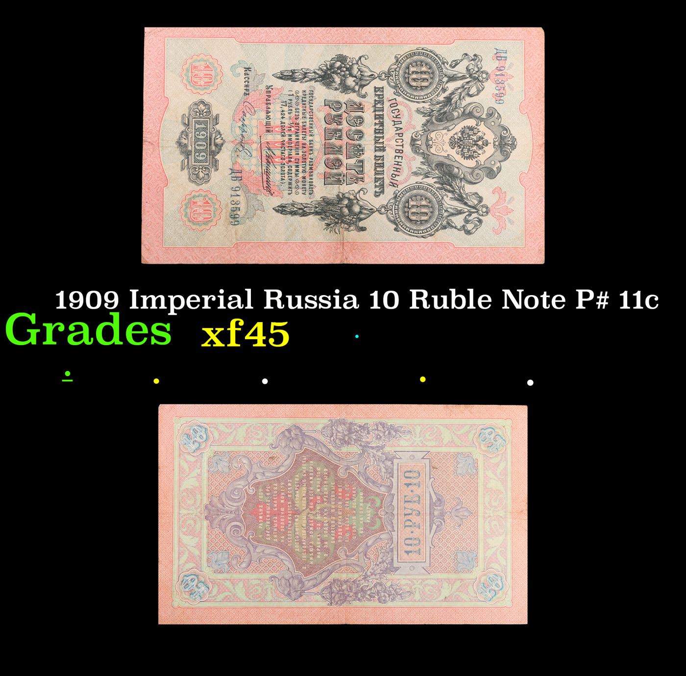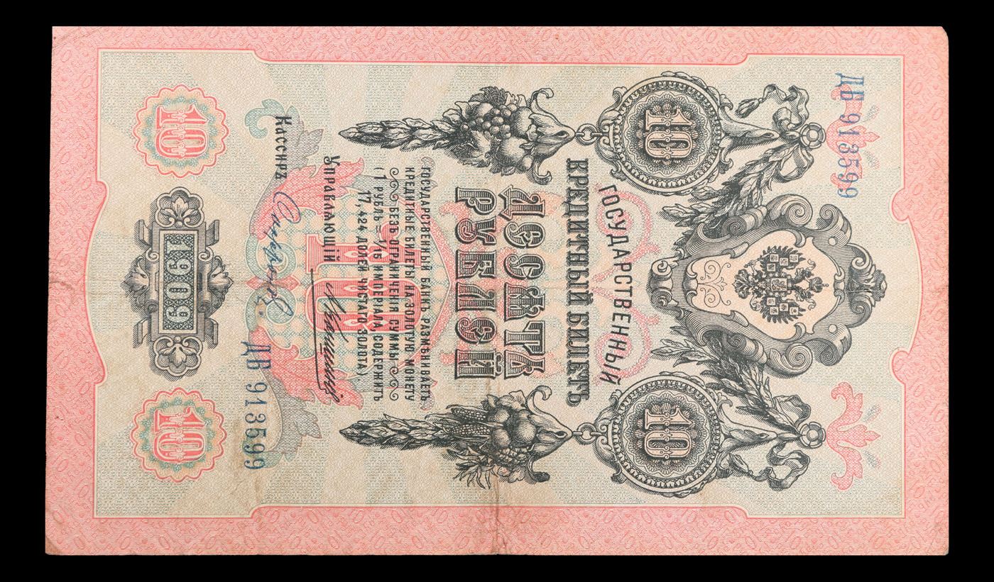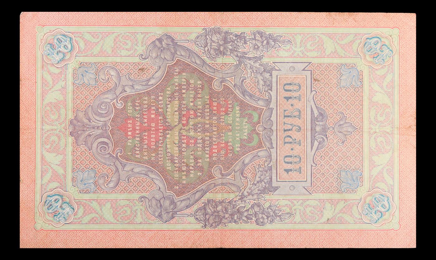 1909 Imperial Russia 10 Ruble Note P# 11c Grades xf+. Up for auction we have a beautiful, ornate Imperial Ruble note from the final decade of the Russian Empire under Tsar Nicholas II, which managed to survive through the Russian Revolution and Civil War. These notes became relatively useless in the early Soviet period, due to hyperinflation and other factors, and many were lost or destroyed.
