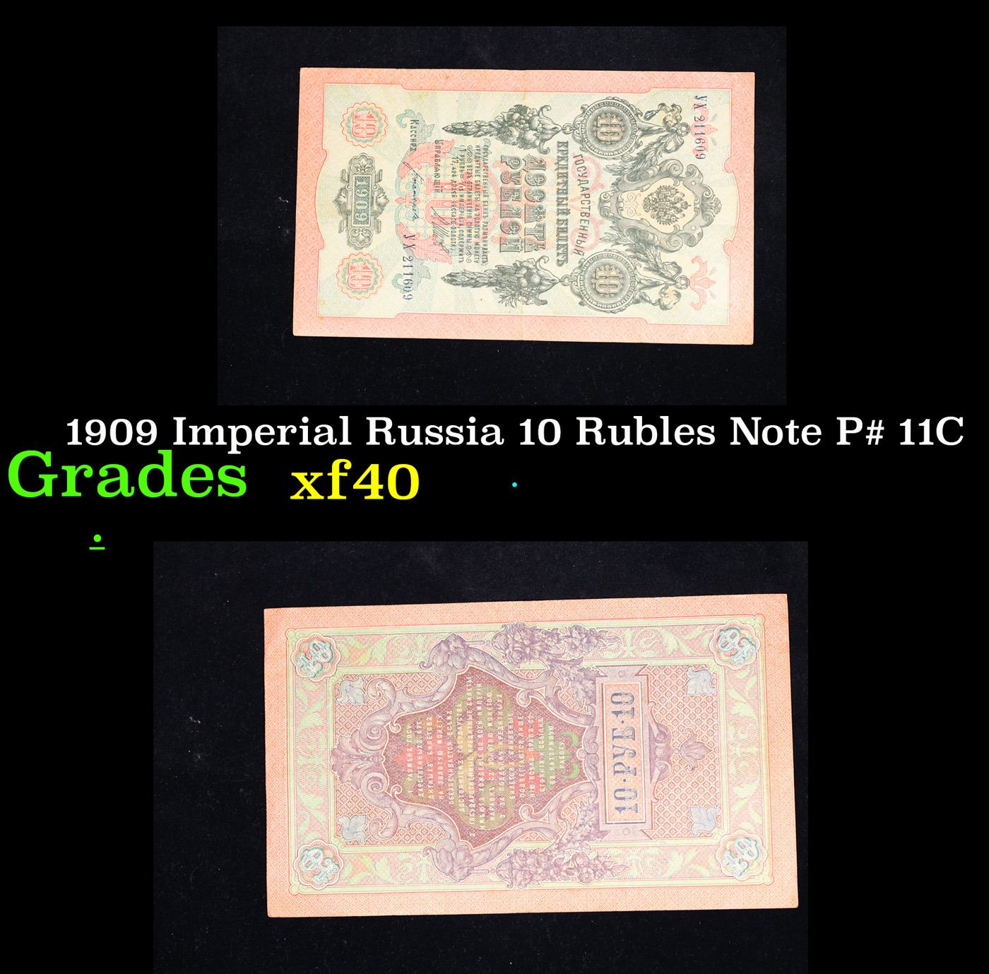 1909 Imperial Russia 10 Rubles Note P# 11C Grades xf. Up for auction we have a beautiful, ornate Imperial Ruble note from the final decade of the Russian Empire under Tsar Nicholas II, which managed to survive through the Russian Revolution and Civil War. These notes became relatively useless in the early Soviet period, due to hyperinflation and other factors, and many were lost or destroyed.