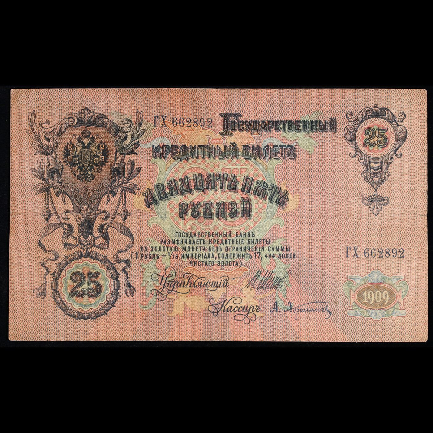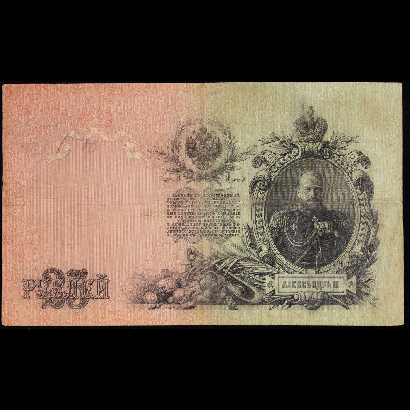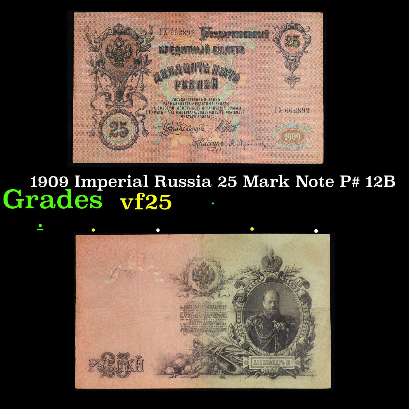 1909 Imperial Russia 25 Mark Note P# 12B Grades vf+.