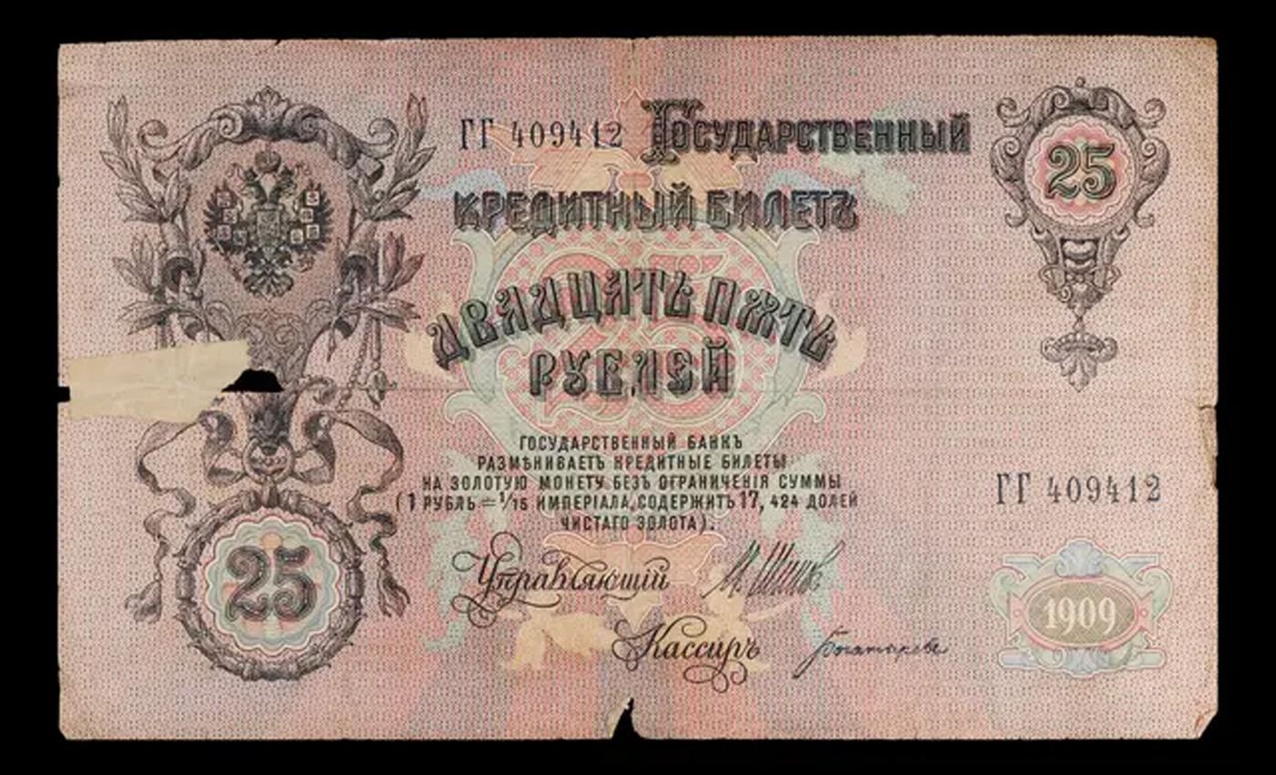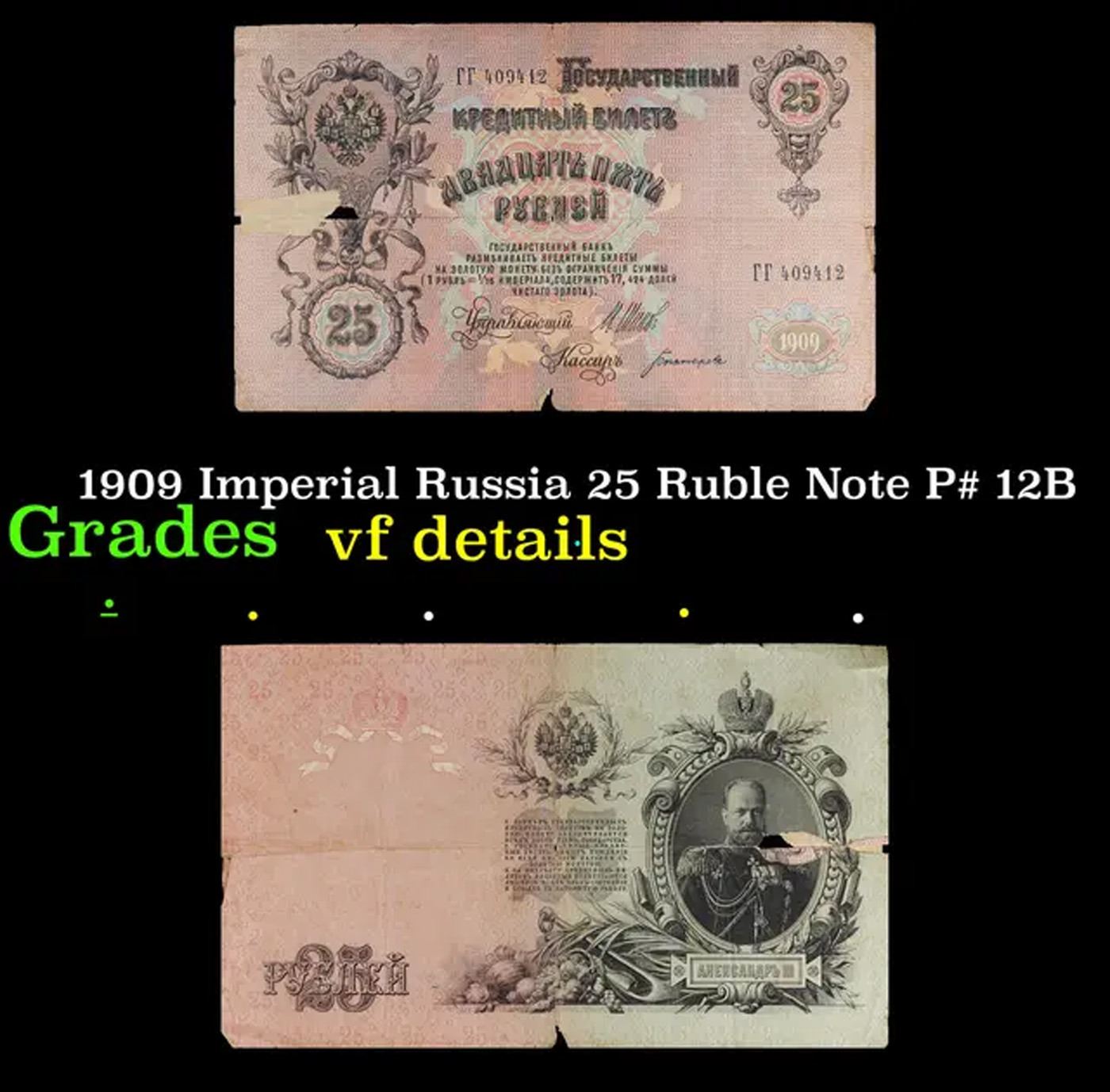 1909 Imperial Russia 25 Ruble Note P# 12B Grades vf details.