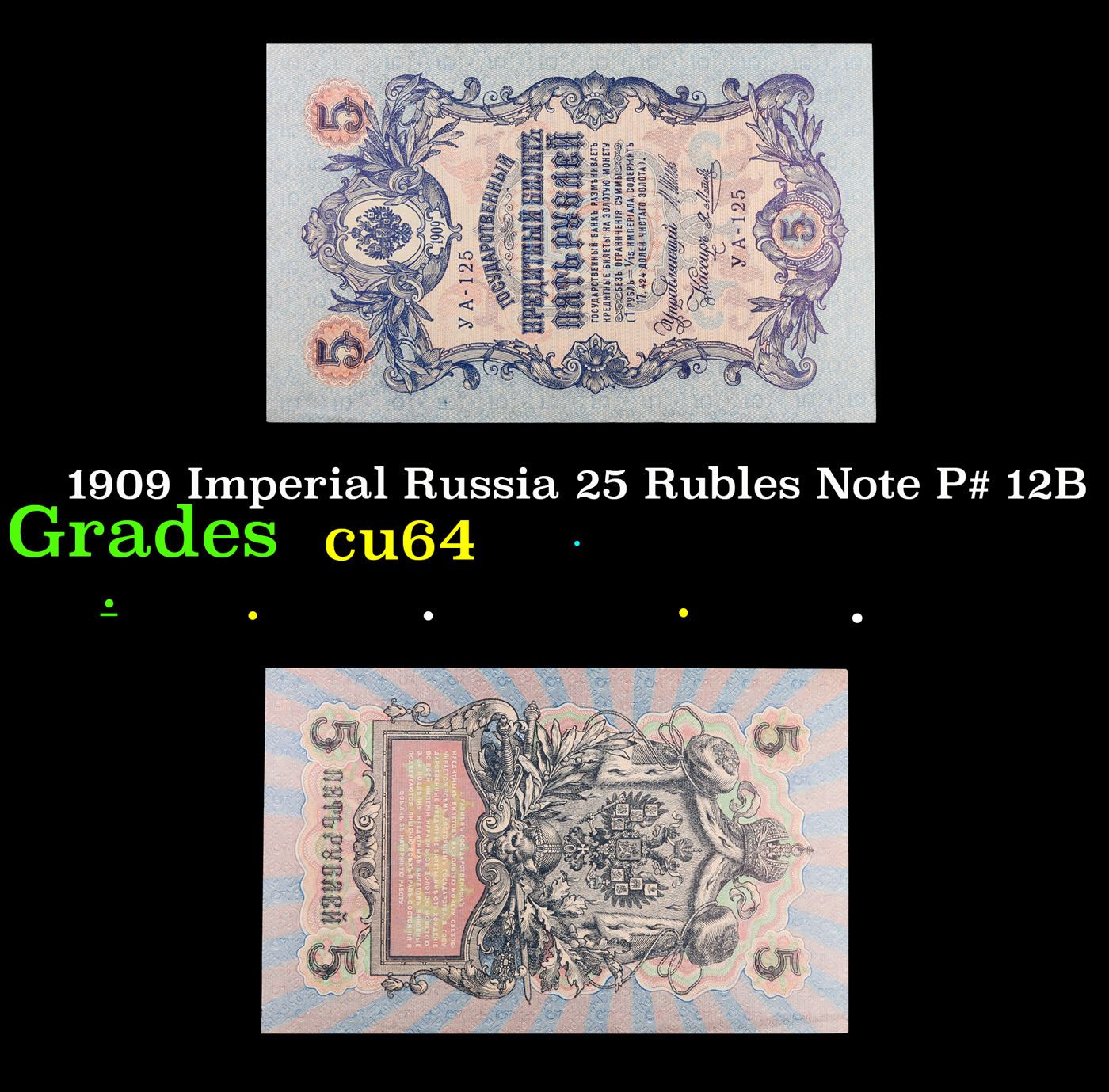 1909 Imperial Russia 25 Rubles Note P# 12B Grades Choice CU. The 25 Ruble note was very slightly larger than the 5 and 10 Rubles notes of the same issue, and differed quite a bit in visual design. The reverse featured a portrait of Tsar Alexander II, whereas the smaller bills featured no portraiture.