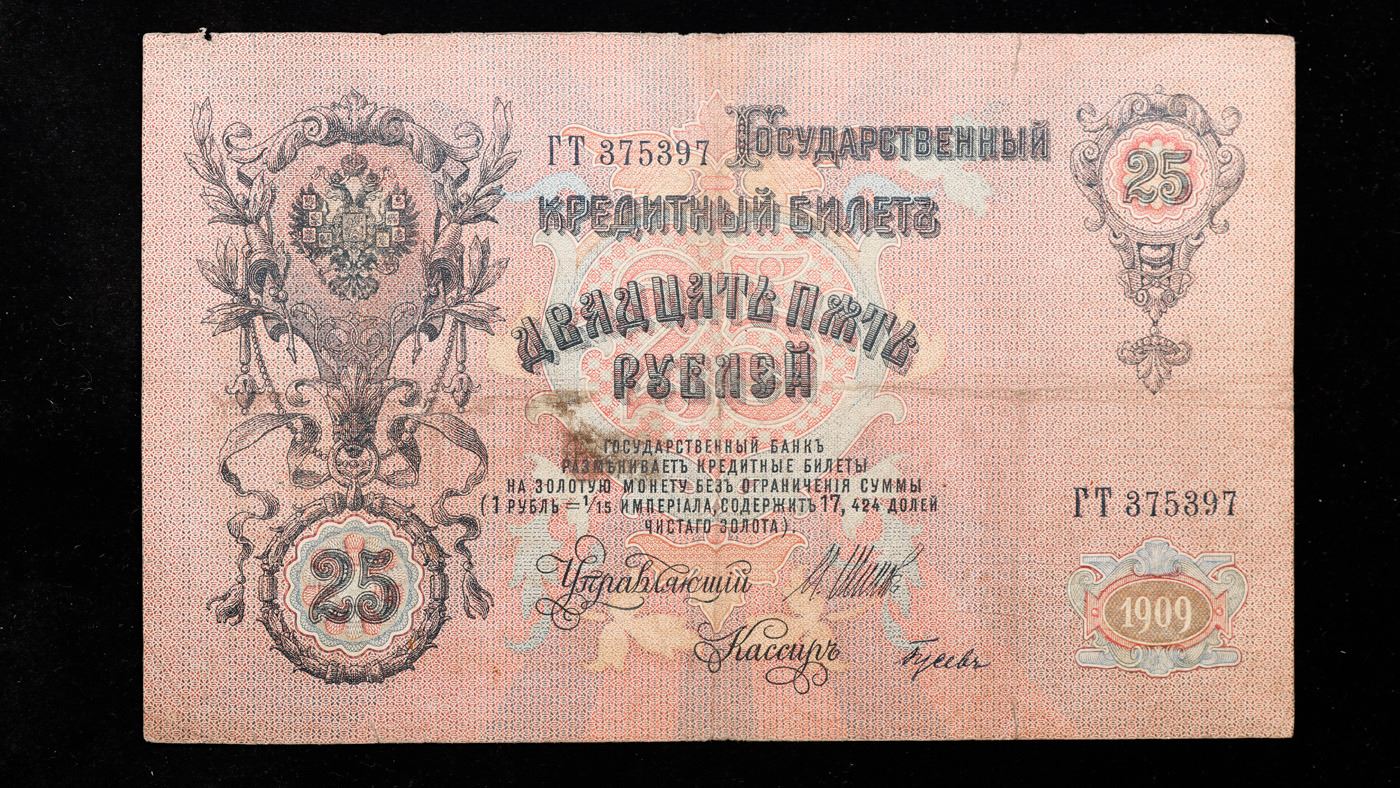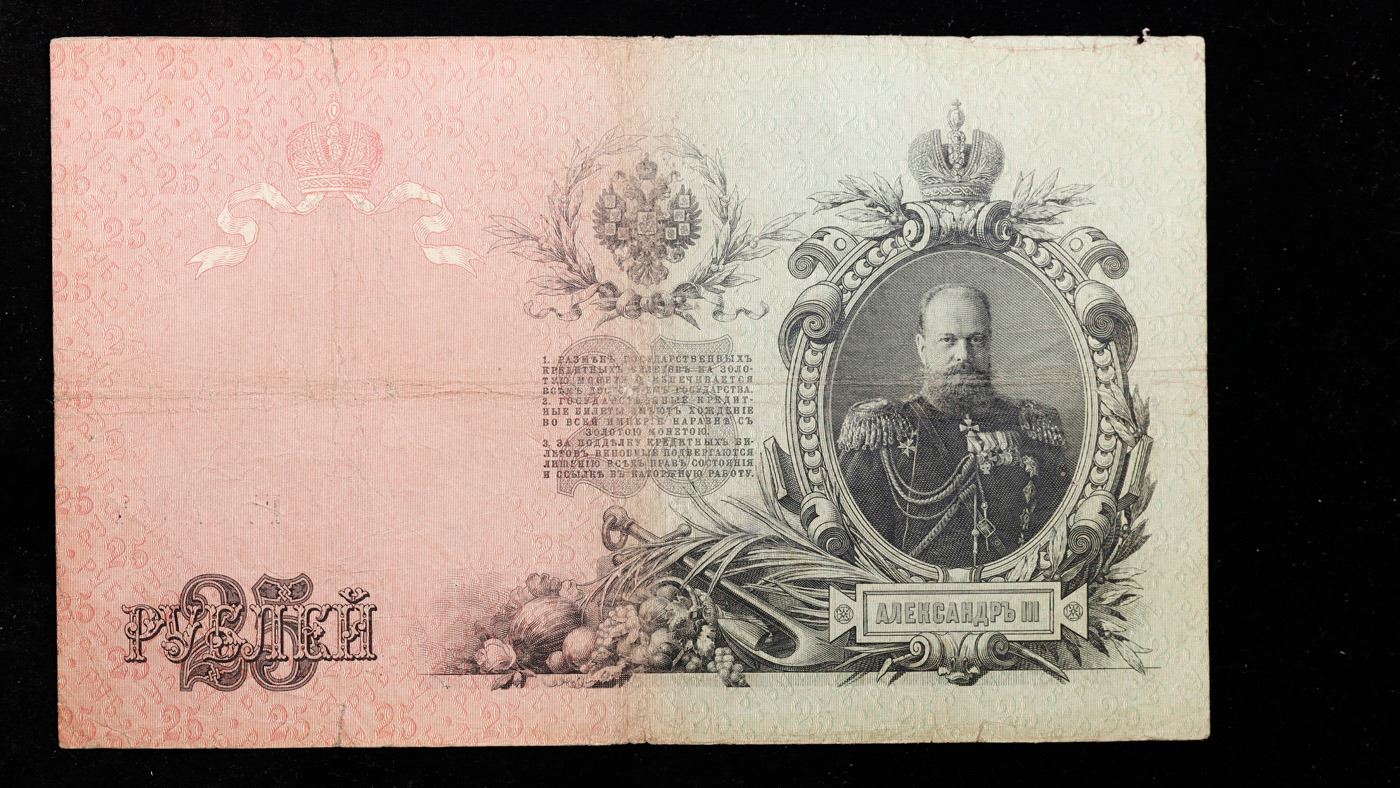 1909 Imperial Russia 25 Rubles Note P# 12B Grades vf++. The 25 Ruble note was very slightly larger than the 5 and 10 Rubles notes of the same issue, and differed quite a bit in visual design. The reverse featured a portrait of Tsar Alexander II, whereas the smaller bills featured no portraiture.