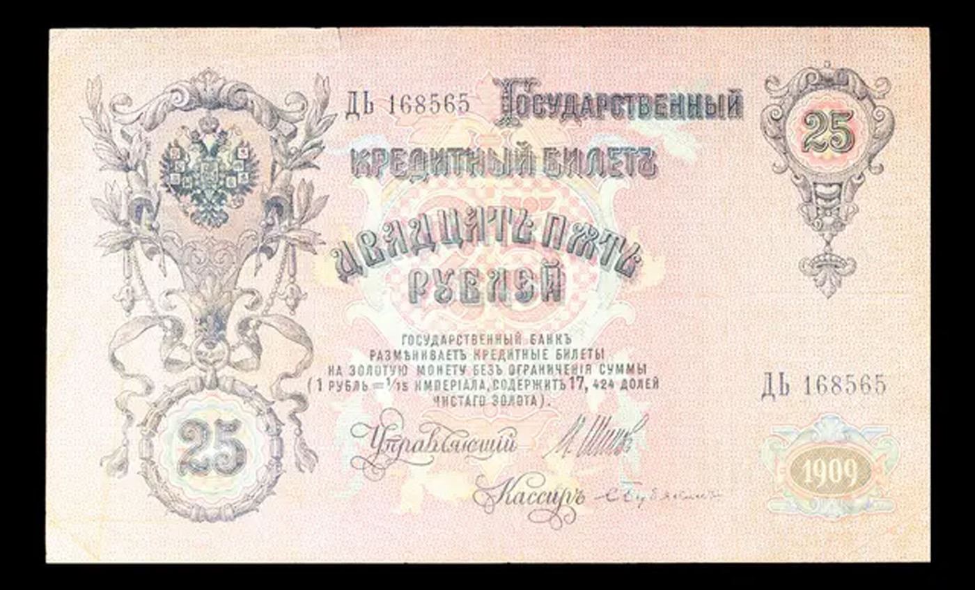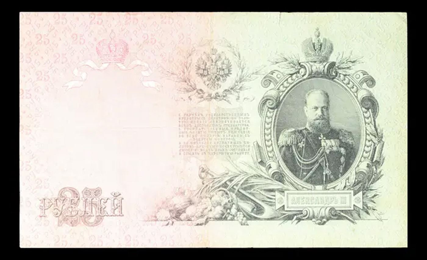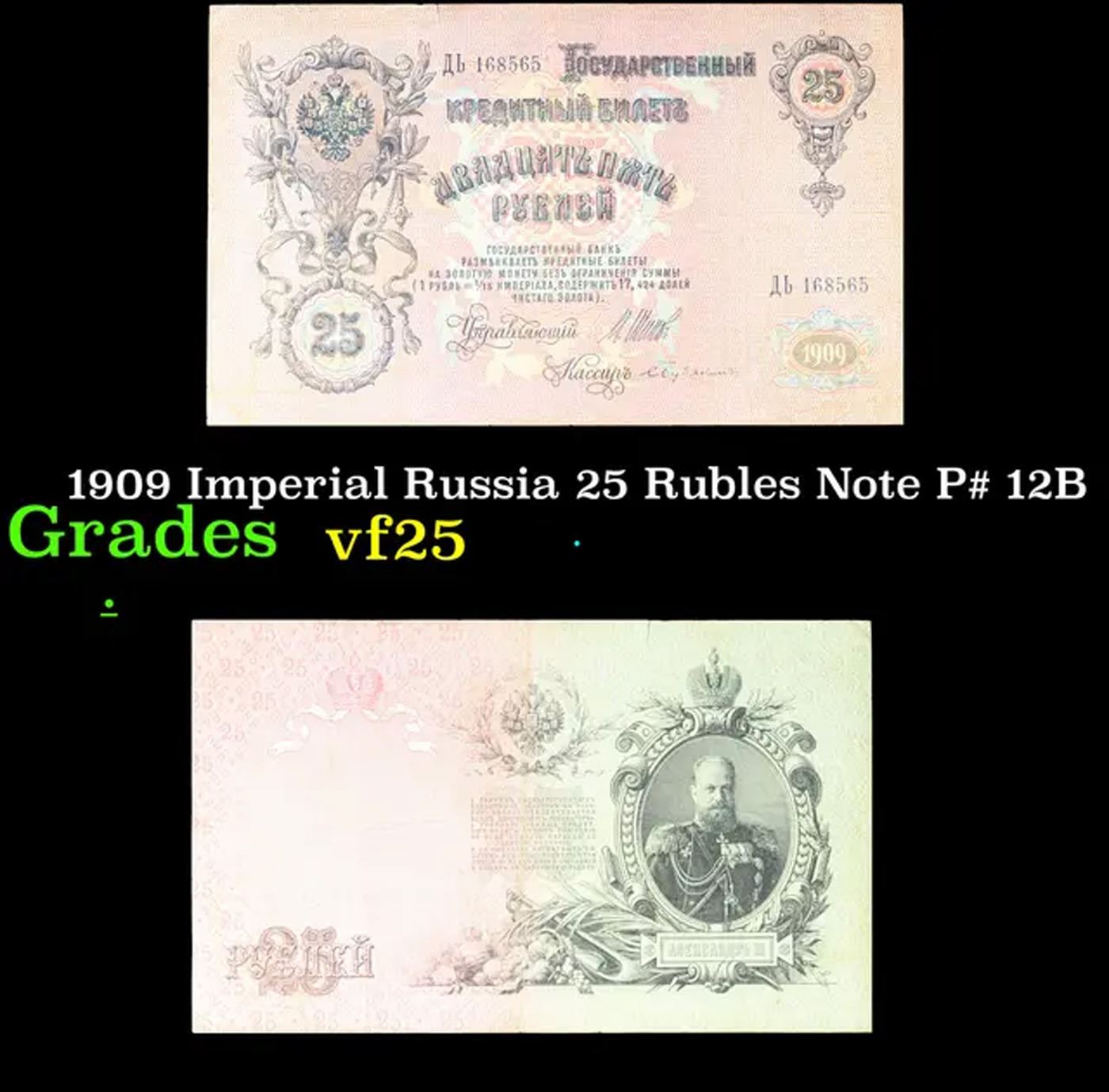 1909 Imperial Russia 25 Rubles Note P# 12B Grades vf+. The 25 Ruble note was very slightly larger than the 5 and 10 Rubles notes of the same issue, and differed quite a bit in visual design. The reverse featured a portrait of Tsar Alexander II, whereas the smaller bills featured no portraiture.