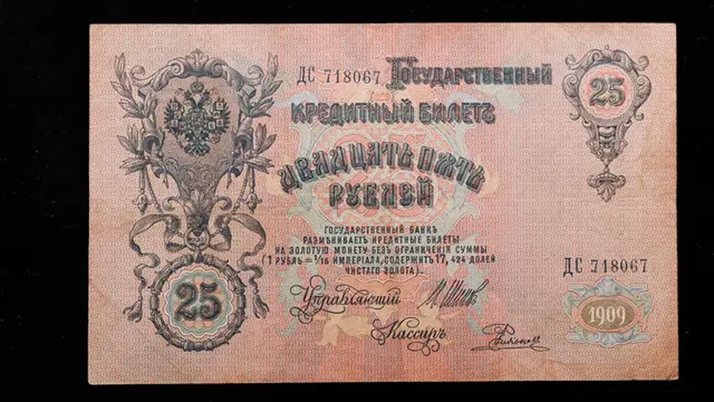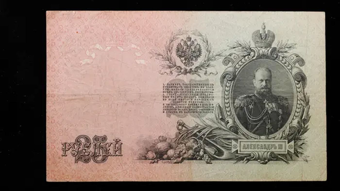 1909 Imperial Russia 25 Rubles Note P# 12B Grades vf++. The 25 Ruble note was very slightly larger than the 5 and 10 Rubles notes of the same issue, and differed quite a bit in visual design. The reverse featured a portrait of Tsar Alexander II, whereas the smaller bills featured no portraiture.