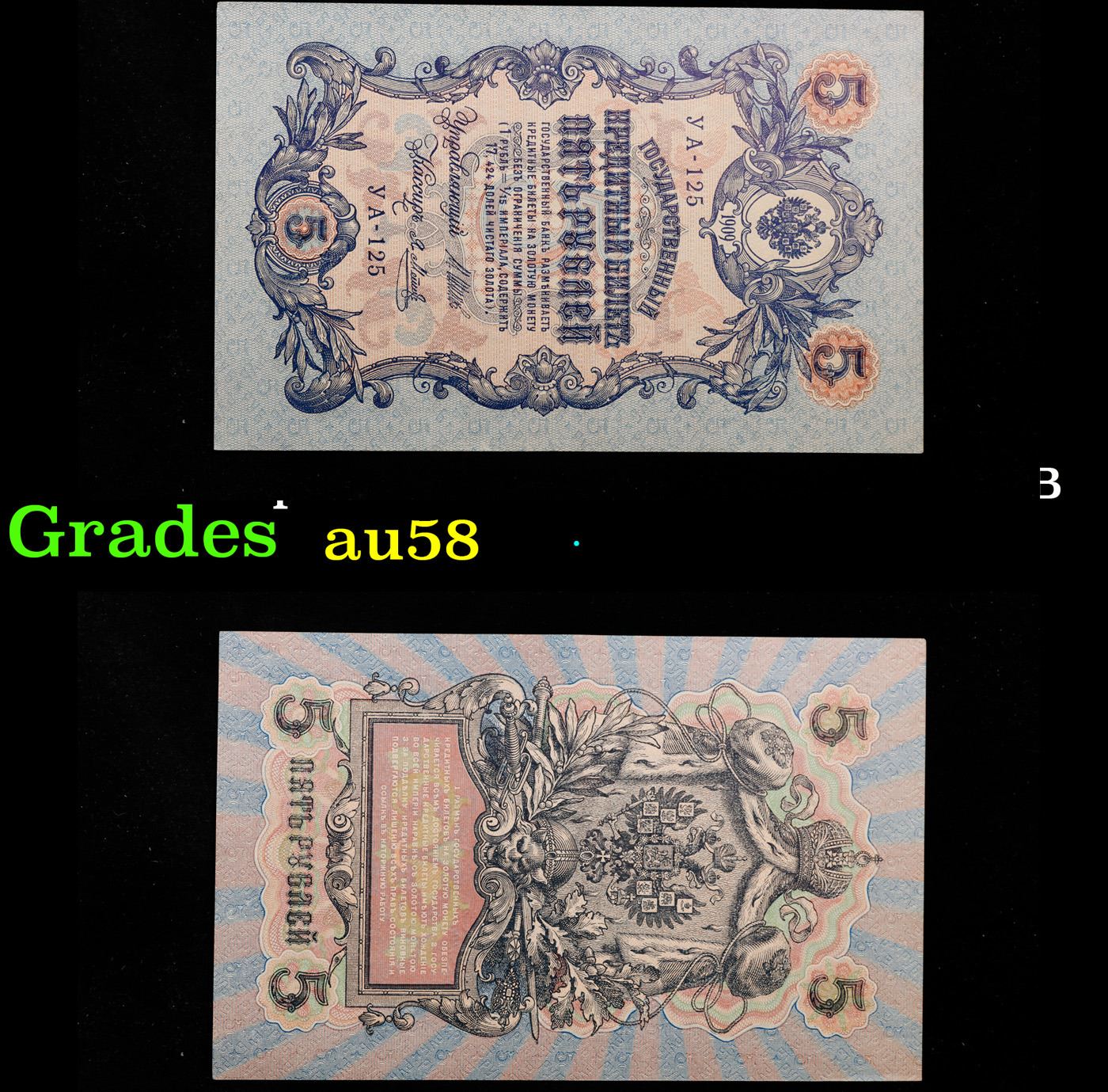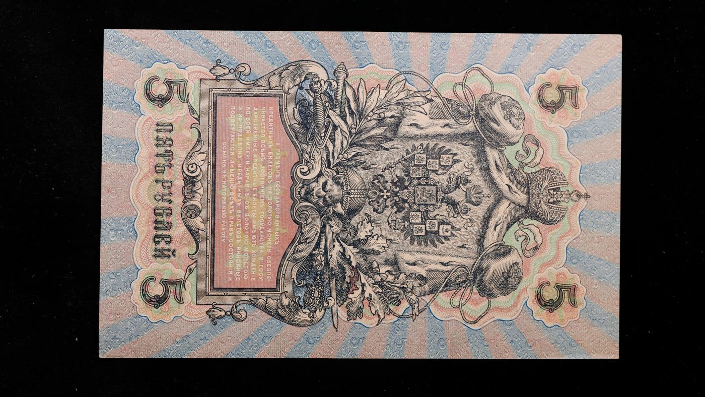 1909 Imperial Russia 5 Ruble Note P# 10B Grades Choice AU/BU Slider. Up for auction we have a beautiful, ornate Imperial Ruble note from the final decade of the Russian Empire under Tsar Nicholas II, which managed to survive through the Russian Revolution and Civil War. These notes became relatively useless in the early Soviet period, due to hyperinflation and other factors, and many were lost or destroyed.