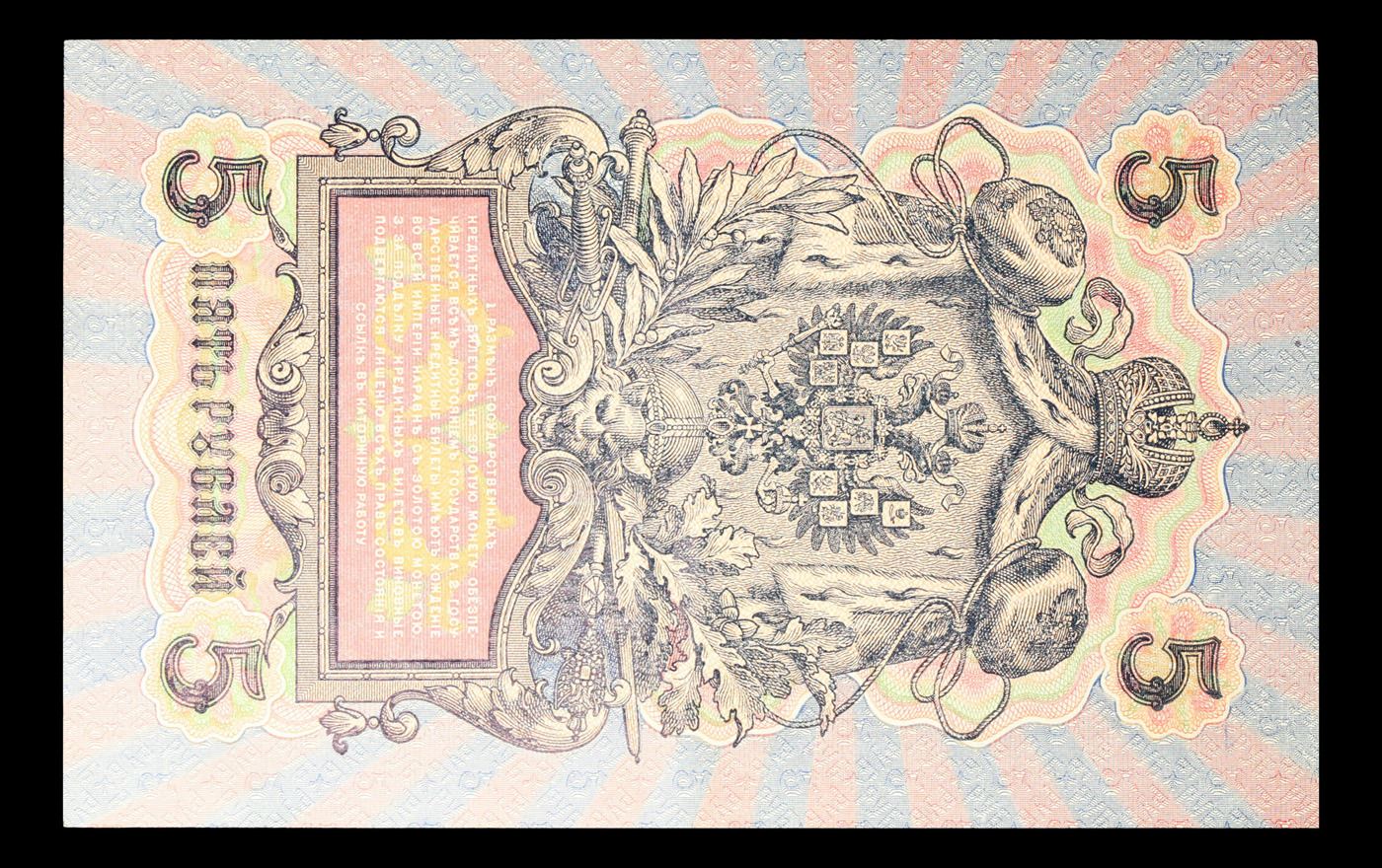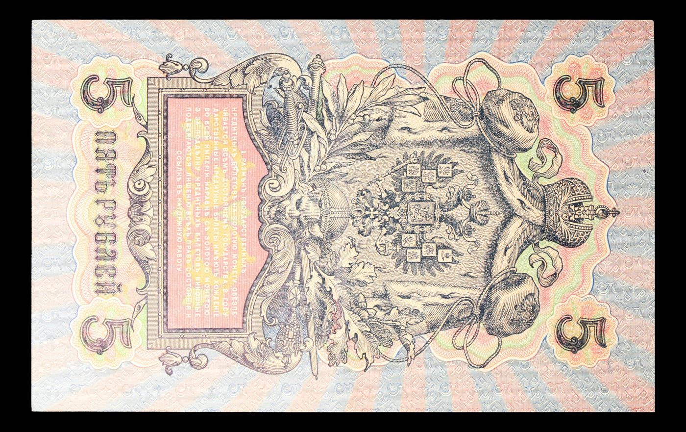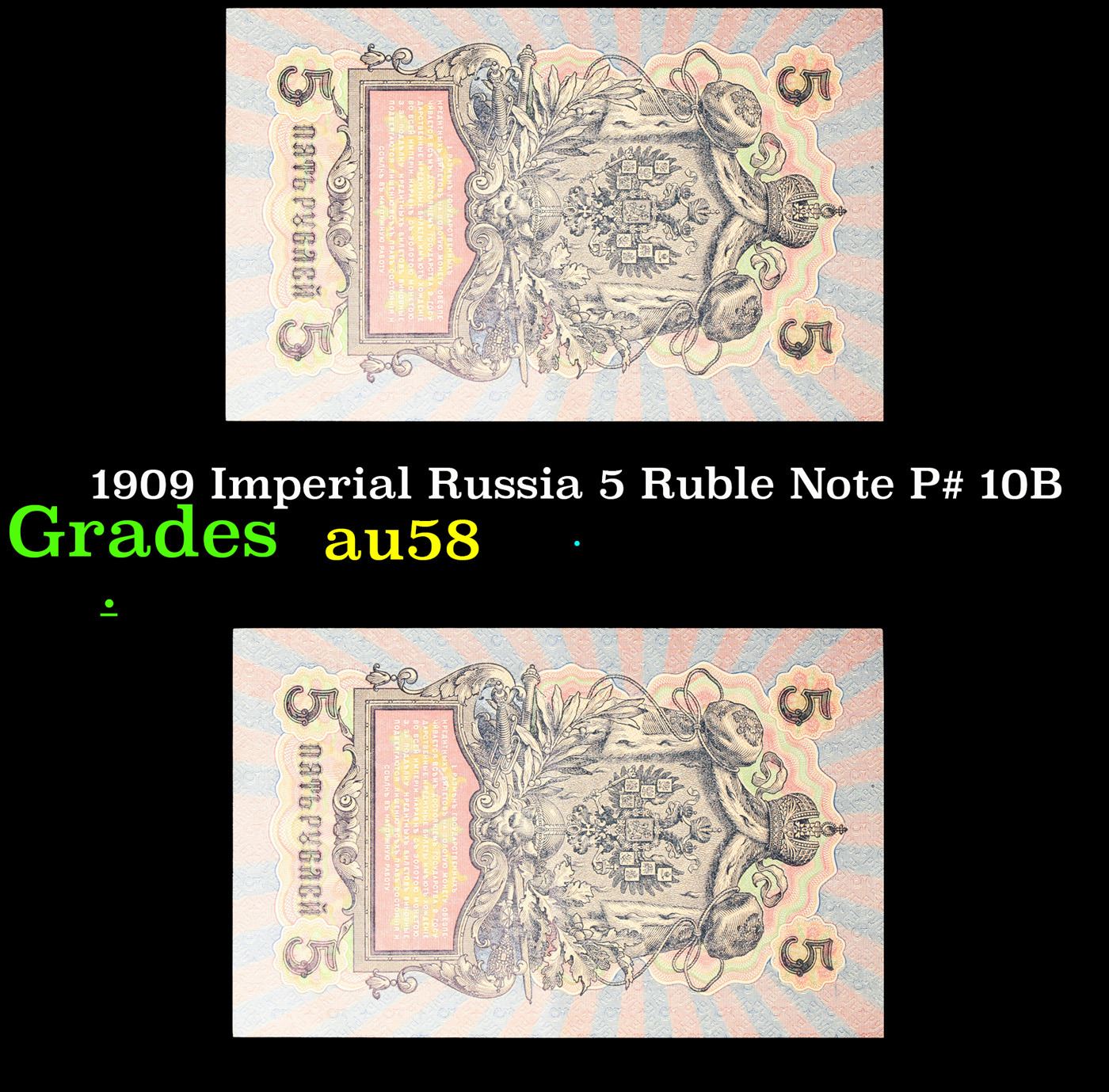 1909 Imperial Russia 5 Ruble Note P# 10B Grades Choice AU/BU Slider. Up for auction we have a beautiful, ornate Imperial Ruble note from the final decade of the Russian Empire under Tsar Nicholas II, which managed to survive through the Russian Revolution and Civil War. These notes became relatively useless in the early Soviet period, due to hyperinflation and other factors, and many were lost or destroyed.