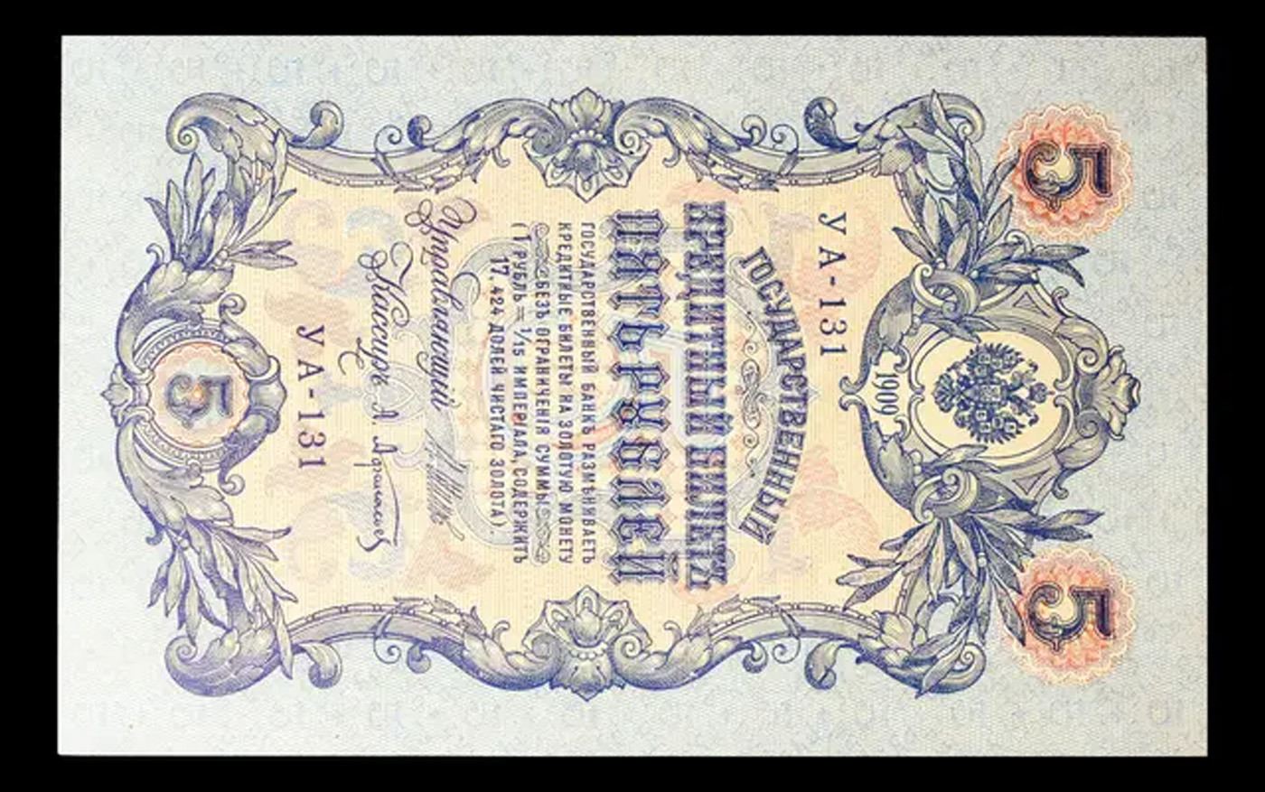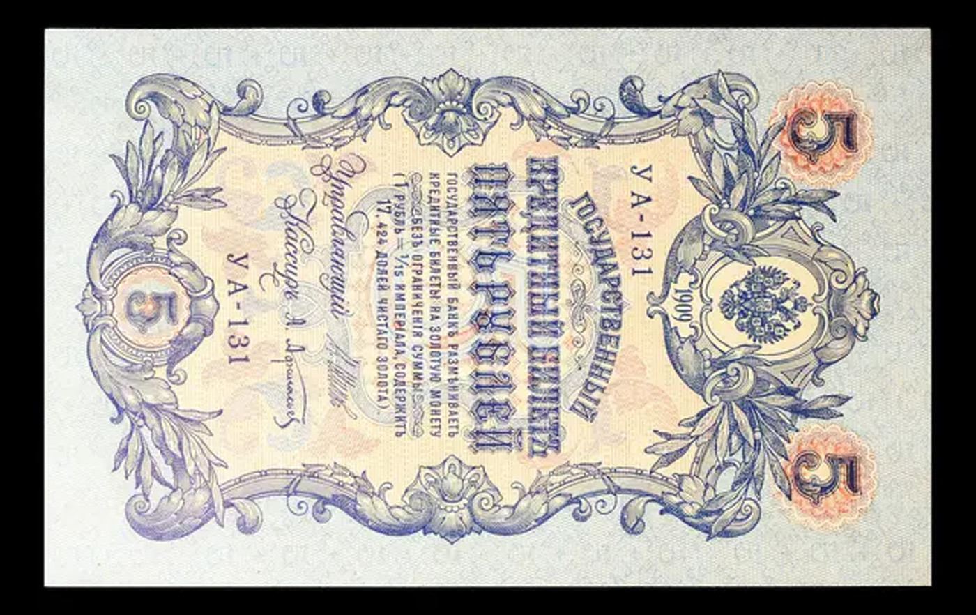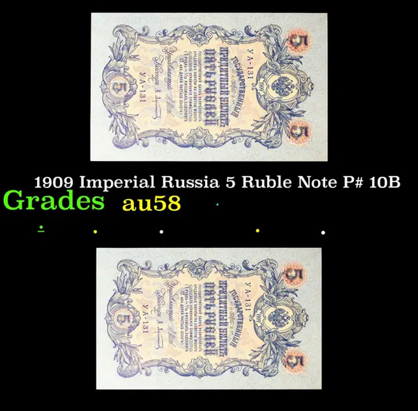 1909 Imperial Russia 5 Ruble Note P# 10B Grades Choice AU/BU Slider. Up for auction we have a beautiful, ornate Imperial Ruble note from the final decade of the Russian Empire under Tsar Nicholas II, which managed to survive through the Russian Revolution and Civil War. These notes became relatively useless in the early Soviet period, due to hyperinflation and other factors, and many were lost or destroyed.