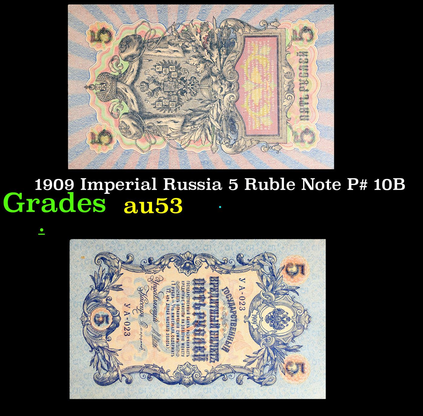 1909 Imperial Russia 5 Ruble Note P# 10B Grades Select AU. Up for auction we have a beautiful, ornate Imperial Ruble note from the final decade of the Russian Empire under Tsar Nicholas II, which managed to survive through the Russian Revolution and Civil War. These notes became relatively useless in the early Soviet period, due to hyperinflation and other factors, and many were lost or destroyed.