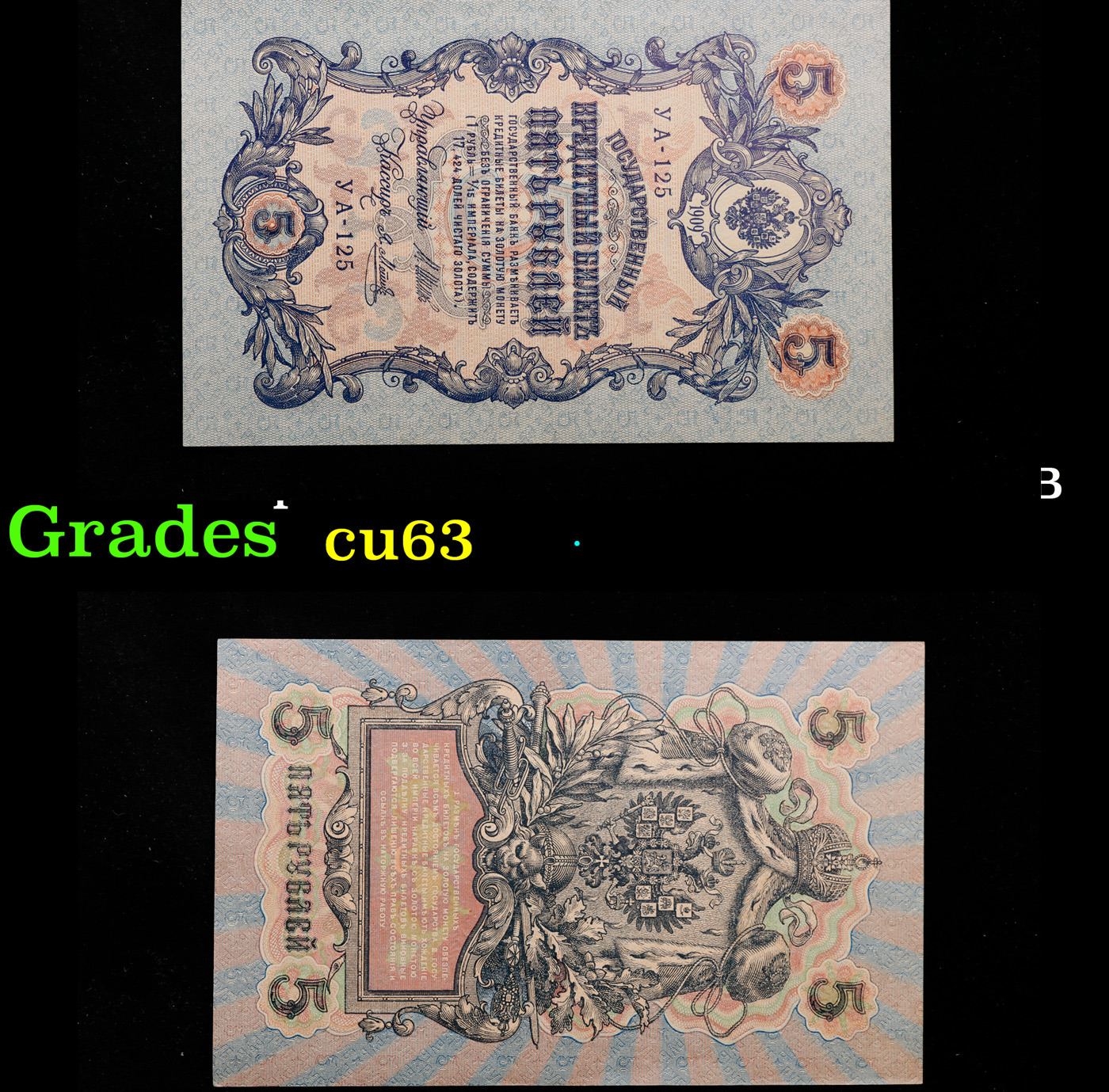 1909 Imperial Russia 5 Ruble Note P# 10B Grades Select CU. Up for auction we have a beautiful, ornate Imperial Ruble note from the final decade of the Russian Empire under Tsar Nicholas II, which managed to survive through the Russian Revolution and Civil War. These notes became relatively useless in the early Soviet period, due to hyperinflation and other factors, and many were lost or destroyed.