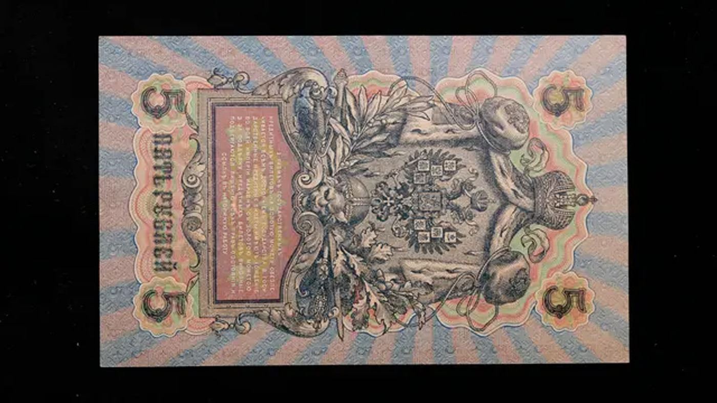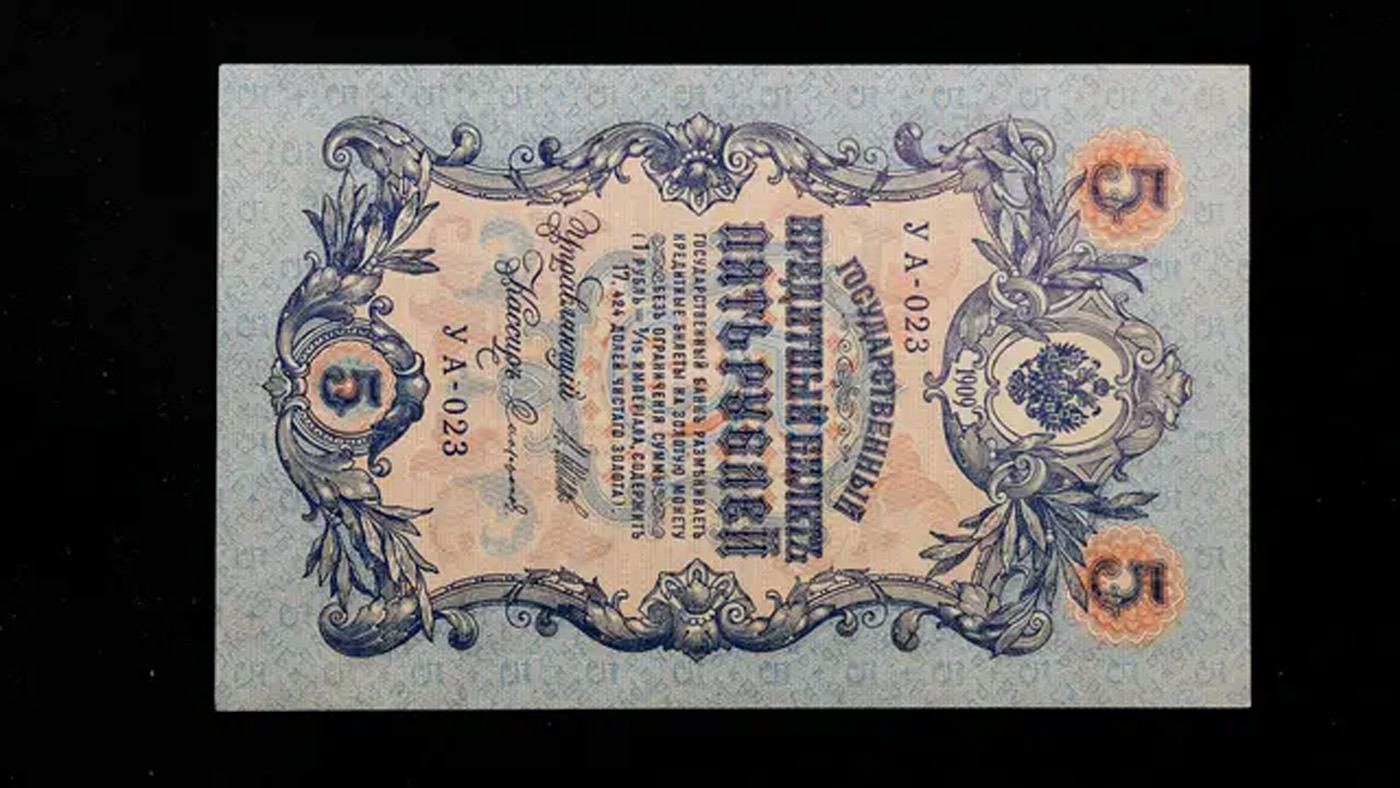 1909 Imperial Russia 5 Ruble Note P# 10B Grades Select CU. Up for auction we have a beautiful, ornate Imperial Ruble note from the final decade of the Russian Empire under Tsar Nicholas II, which managed to survive through the Russian Revolution and Civil War. These notes became relatively useless in the early Soviet period, due to hyperinflation and other factors, and many were lost or destroyed.