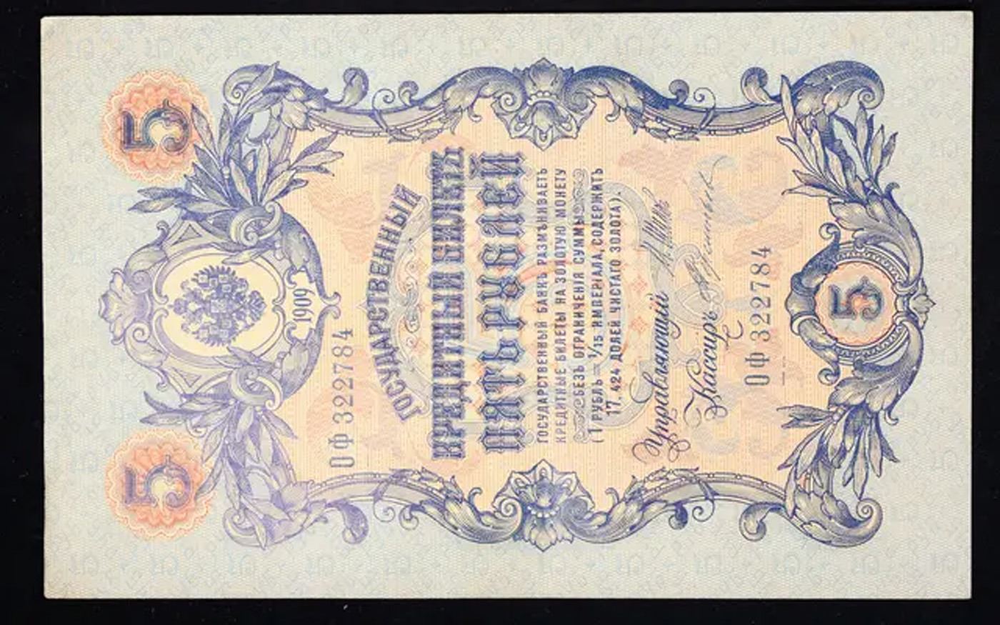 1909 Imperial Russia 5 Ruble Note P# 10B Grades Select CU. Up for auction we have a beautiful, ornate Imperial Ruble note from the final decade of the Russian Empire under Tsar Nicholas II, which managed to survive through the Russian Revolution and Civil War. These notes became relatively useless in the early Soviet period, due to hyperinflation and other factors, and many were lost or destroyed.