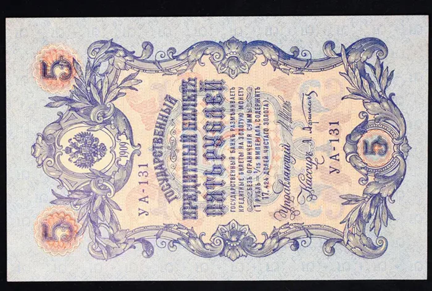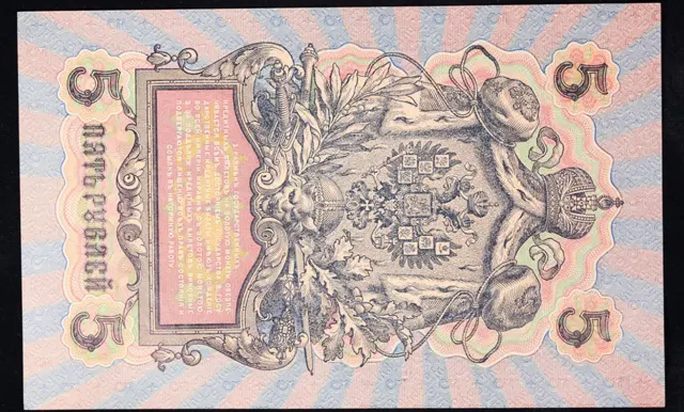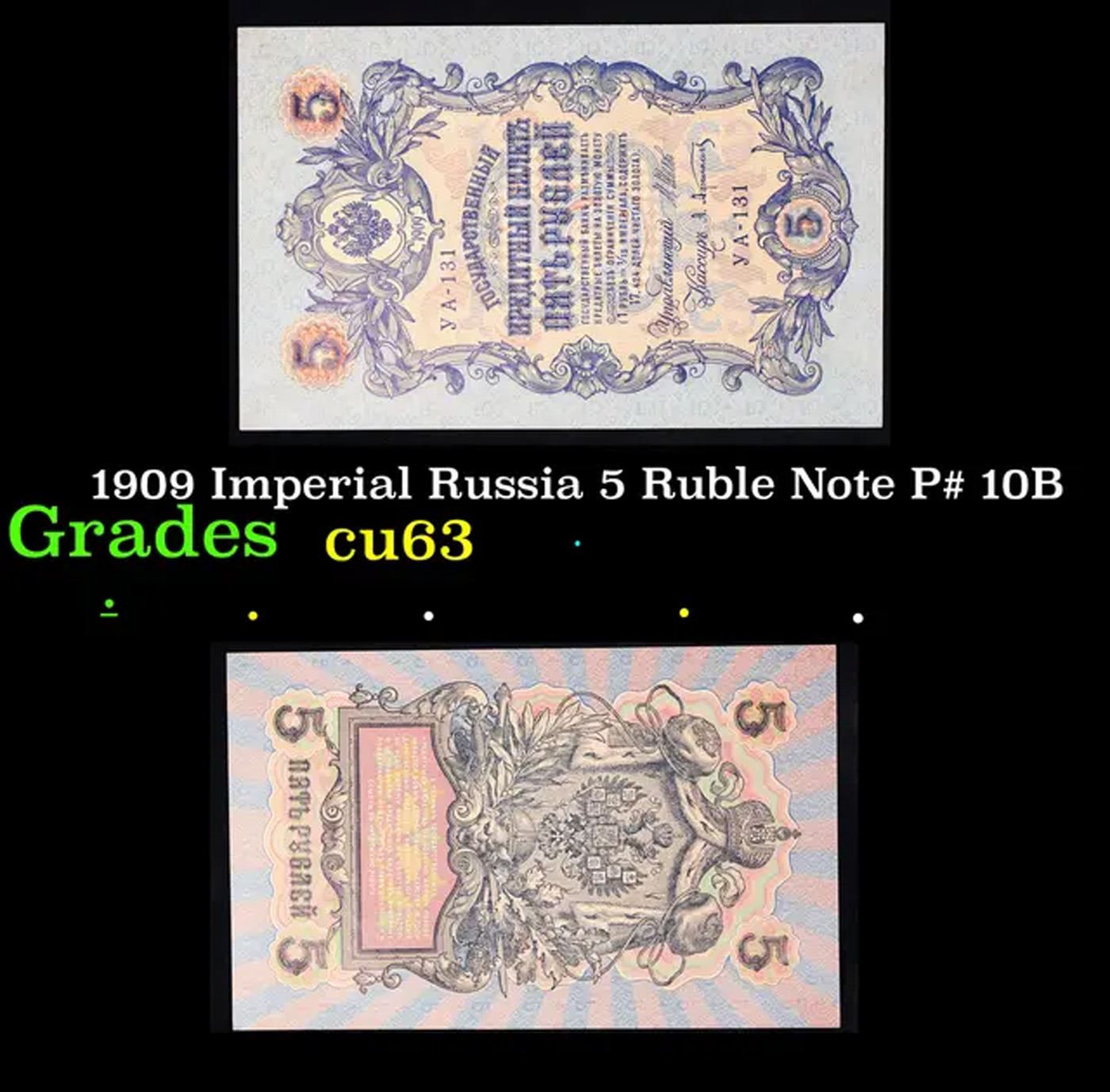 1909 Imperial Russia 5 Ruble Note P# 10B Grades Select CU. Up for auction we have a beautiful, ornate Imperial Ruble note from the final decade of the Russian Empire under Tsar Nicholas II, which managed to survive through the Russian Revolution and Civil War. These notes became relatively useless in the early Soviet period, due to hyperinflation and other factors, and many were lost or destroyed.