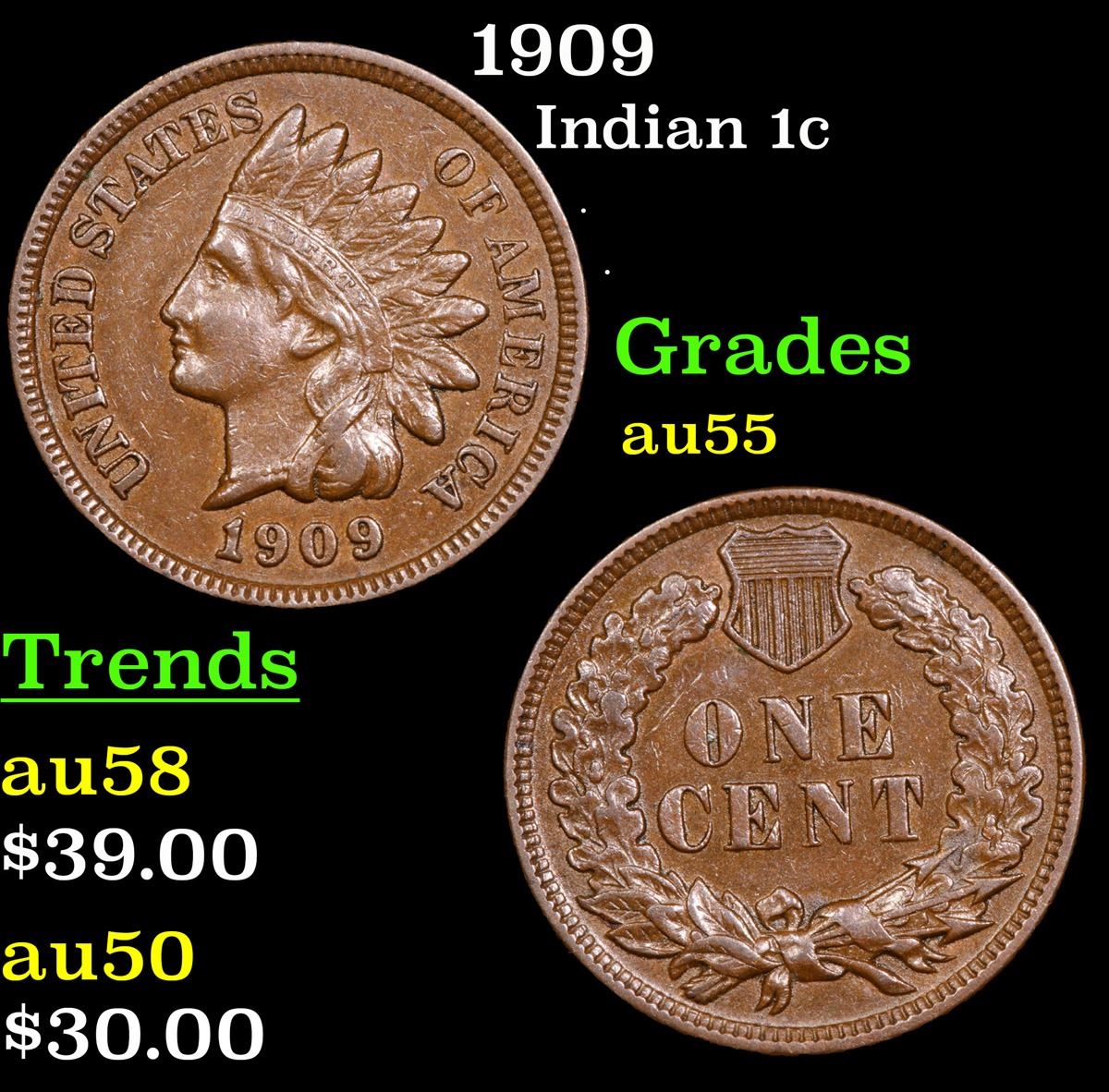 1909 . . Indian Cent 1c Grades Choice AU.