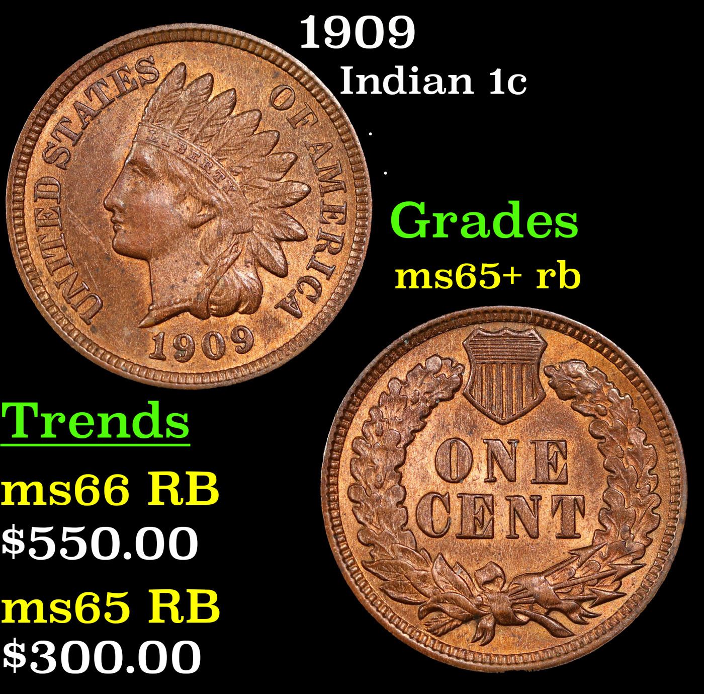 1909 Indian Cent 1c Grades Gem+ Unc RB.