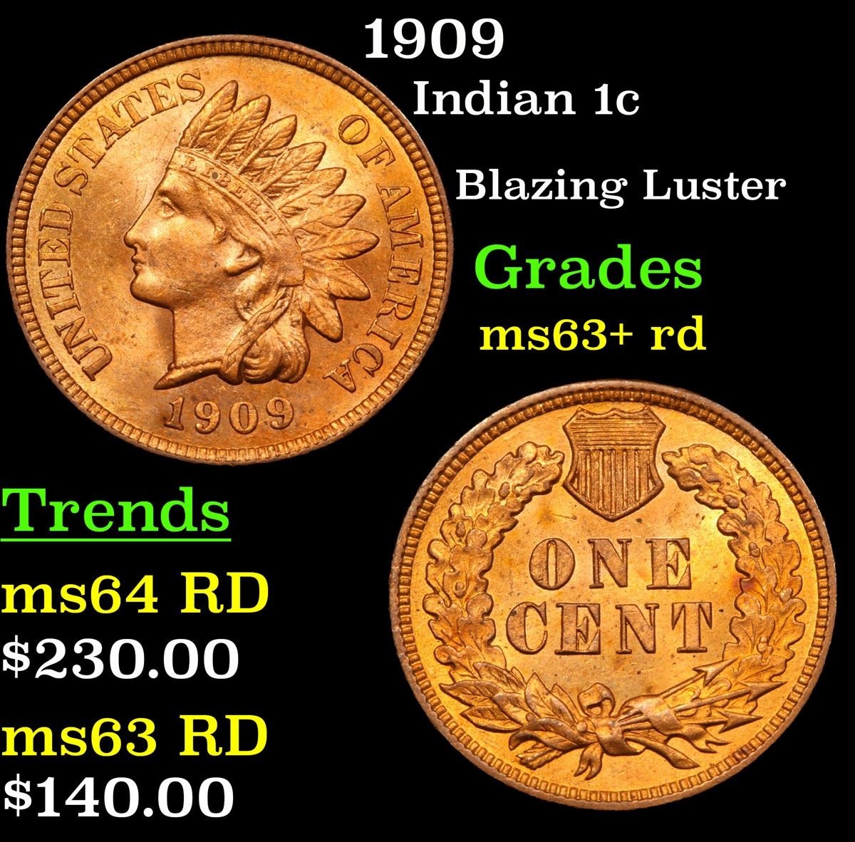 1909 Indian Cent 1c Grades Select+ Unc RD.