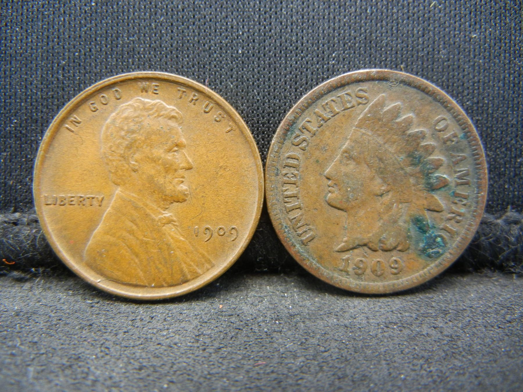 1909 Indian Cent and 1909-VDB Lincoln Cent.