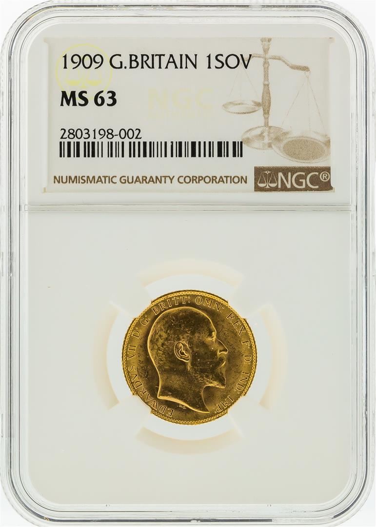 One 1909 NGC MS63 Great Britain 1 Sovereign Gold Coin. NGC Certified.
