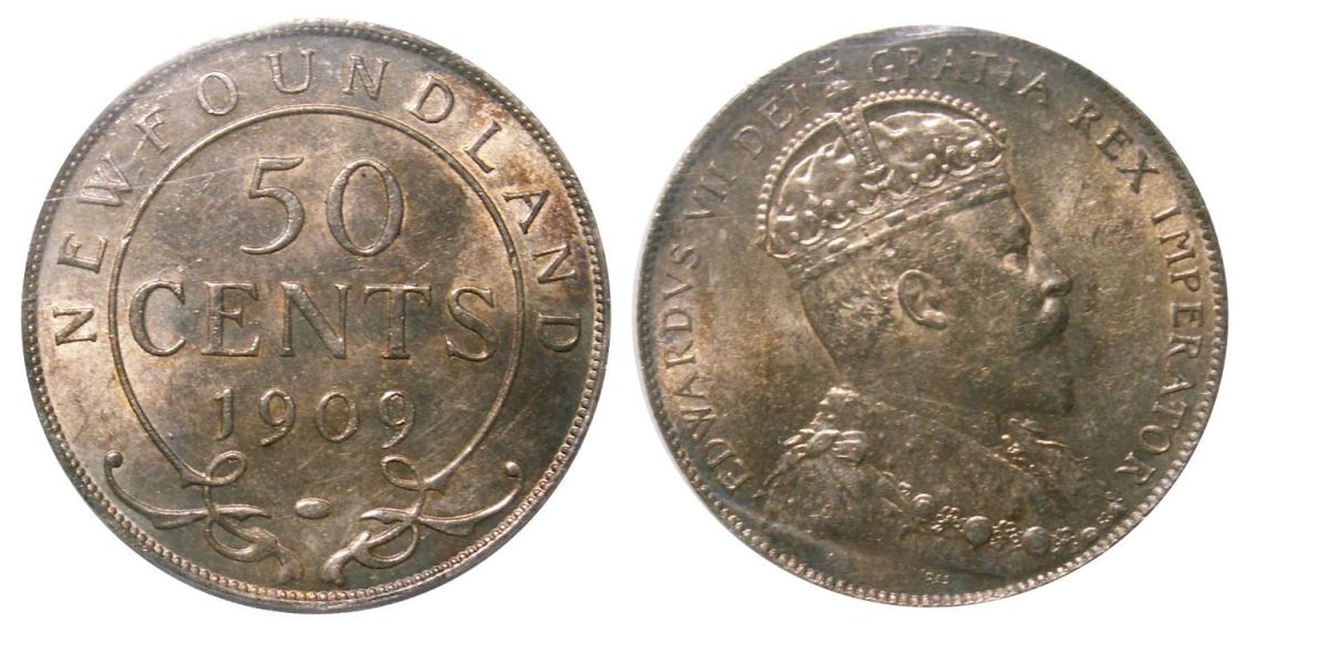 1909 Nfld 50¢ ICCS MS64. Attractive golden tone with lots of underlying lustre. Tied for finest graded.