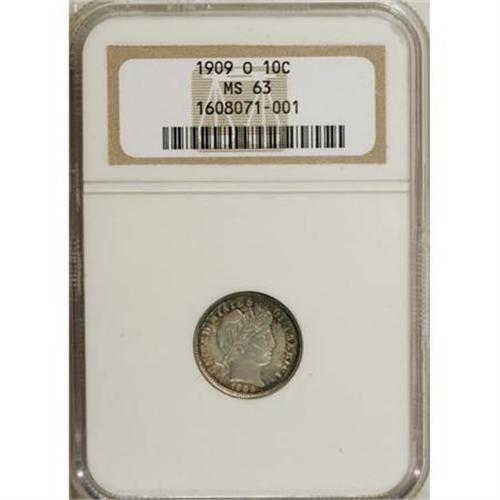 <B>1909-O 10C MS63 NGC.</B></I> NGC Census: (18/43). PCGS Population (16/45). Mintage: 2,287,000. Numismedia Wsl. Price for NGC/PCGS coin in MS63: $420. (#4852)<BR><BR><B>Coin Engraver:</B> Charles E. Barber<BR><BR><b>Shipping:</b> Coins & Currency (<a target="_blank" href="http://www.heritageauctions.com/common/shipping.php">view shipping information</a>\)