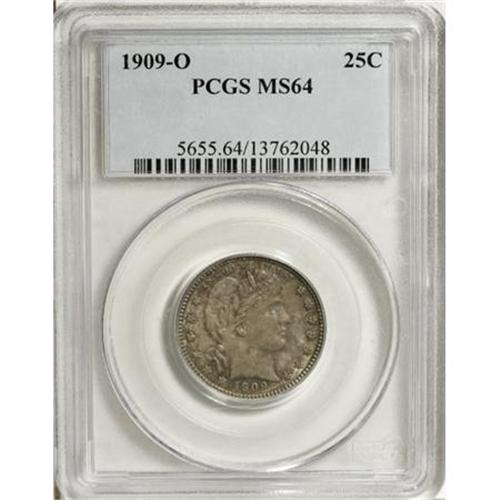 <B>1909-O 25C MS64 PCGS.</B></I> This quarter was struck during the final year of coinage operations before the New Orleans Mint permanently ceased production. All three denominations of Barber silver coins were struck during the year, along with a brief coinage of Indian half eagles. Natural gray-brown surfaces are accompanied by splashes of cobalt-blue and iridescent toning. Population: 15 in 64, 7 finer (8/07).<BR><BR><B>Coin Engraver:</B> Charles E. Barber<BR><BR><b>Shipping:</b> Coins & Currency (<a target="_blank" href="http://www.heritageauctions.com/common/shipping.php">view shipping information</a>)