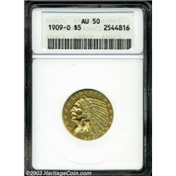 <table><tr><td><TABLE cellSpacing=0 cellPadding=0 width="100%" bgColor=#000000 border=0><TBODY> <TR><TD width="100%"><TABLE cellSpacing=1 cellPadding=3 width="100%" border=0><TBODY><TR><TD width="100%" bgColor=#79735c><FONT face=arial color=#ffffff size=3><B>Description</B> </FONT></TD></TR><TR><TD width="100%" bgColor=#ffffff><FONT face=arial size=2><B>1909-O $5 AU50 ANACS.</B></I> This New Orleans issue, with an original mintage of just 34,200 pieces, is the key to the series and is the final gold product from this Southern mint. Although lightly circulated, this example displays ample luster and is delightfully free of any disfiguring abrasions on the obverse. The upper reverse has a couple of larger abrasions, but this remains an excellent choice for the collector who is missing this date but doesn't want to stretch to the five-figure range for an Uncirculated example. </FONT></TD></TR></TBODY></TABLE></TD></TR></TBODY></TABLE><BR><A name=PricesRealized></A><TABLE cellSpacing=0 cellPadding=0 width="100%" bgColor=#000000 border=0><TBODY><TR><TD width="100%"><TABLE cellSpacing=1 cellPadding=3 width="100%" border=0><TBODY><TR><TD width="100%" bgColor=#79735c><A name=PR><FONT face=arial color=#ffffff size=3><B>Previous Prices from Heritage Auctions</B> </FONT></A></TD></TR><TR><TD bgColor=#f6f6ed><TABLE cellSpacing=0 cellPadding=0 width="100%" border=1><TBODY><TR><TD align=middle width="33%"><B>Date</B></TD><TD align=middle width="33%"><B>Service</B></TD><TD align=middle width="33%"><B>Price</B></TD></TR><TR bgColor=whitesmoke><TD width="33%"><B>07/15/2003</B></TD><TD width="33%">NGC</TD><TD width="33%">$2,070.00</TD></TR><TR bgColor=whitesmoke><TD width="33%"><B>08/08/2001</B></TD><TD width="33%">NGC</TD><TD width="33%">$2,185.00</TD></TR><TR bgColor=whitesmoke><TD width="33%"><B>02/05/1994</B></TD><TD width="33%">ANACS</TD><TD width="33%">$1,155.00</TD></TR><TR bgColor=whitesmoke><TD width="33%"><B>01/01/1991</B></TD><TD width="33%">NGC</TD><TD width="33%">$1,265.00</TD></TR></TBODY></TABLE></TD></TR><TR><TD bgColor=#ffffff><FONT face=arial size=1 ?>PLEASE NOTE: All prices realized reflect the final hammer price PLUS the buyer's premium in auctions that charge a buyer's premium. Each item has a notation at the top of the listing indicating whether that lot included a buyer's premium. Example: A item that sells with a final hammer price of $100 and a 20% buyer's premium will display with a price realized of $120. All information listed is intended to be as accurate as possible, but errors are possible. Please use this guide carefully and inform us of any inaccuracies. </FONT></TD></TR></TBODY></TABLE></TD></TR></TBODY></TABLE><BR><TABLE cellSpacing=0 cellPadding=0 width="100%" bgColor=#000000 border=0><TBODY><TR><TD width="100%"><TABLE cellSpacing=1 cellPadding=3 width="100%" border=0><TBODY><TR><TD width="100%" bgColor=#79735c colSpan=6><FONT face=arial color=#ffffff size=3><B>Price Guide*</B> </FONT></TD></TR><TR bgColor=#f6f6ed><TD align=middle><B>Grade</B> </TD><TD align=middle><B>Coin World<BR>(Trends)</B> </TD><TD align=middle><B>Numismedia<BR>Retail</B> </TD><TD align=middle><B>Numismedia<BR>Wholesale</B> </TD><TD align=middle><B>Coin<BR>Universe</B> </TD><TD align=middle><B>Heritage<BR>Value Index</B> </TD></TR><TR bgColor=#ffffff><TD align=middle>45</TD><TD align=right>---</TD><TD align=right>---</TD><TD align=right>---</TD><TD align=right>---</TD><TD align=right>$1,435.42</TD></TR><TR style="FONT-WEIGHT: bold" bgColor=#cccfdd><TD align=middle>50</TD><TD align=right>$2,500.00</TD><TD align=right>---</TD><TD align=right>$2,125.00</TD><TD align=right>---</TD><TD align=right>$2,268.33</TD></TR><TR bgColor=#ffffff><TD align=middle>53</TD><TD align=right>---</TD><TD align=right>---</TD><TD align=right>$2,375.00</TD><TD align=right>---</TD><TD align=right>$2,885.58</TD></TR><TR bgColor=#ffffff><TD colSpan=6><FONT size=1>*All information listed is intended to be as accurate as possible, but errors are possible. No item may be returned or refused based on this information which is provided as a service to our customers. You should contact each pricing source directly to determine the accuracy of this information. </FONT></TD></TR></TBODY></TABLE></TD></TR></TBODY></TABLE><BR><TABLE cellSpacing=0 cellPadding=0 width="100%" bgColor=#000000 border=0><TBODY><TR><TD width="100%"><TABLE cellSpacing=1 cellPadding=3 width="100%" border=0><TBODY><TR><TD width="100%" bgColor=#79735c><FONT face=arial color=#ffffff size=3><B>Population Guide</B> </FONT></TD></TR><TR bgColor=#ffffff><TD align=middle><!-- Begin Output of Population Grid--><TABLE cellSpacing=0 cellPadding=0 width="100%" border=0><TBODY><TR><TD vAlign=center><TABLE cellSpacing=0 width="100%" border=1 cellsadding="3"><TBODY><TR><TD vAlign=center><TABLE cellSpacing=0 cellPadding=3 width="100%" border=1><TBODY><TR><TD vAlign=center align=middle bgColor=#f0f1e8 colSpan=2 <CENTER><FONT face=Arial size=2><B>PCGS Pop </B></FONT><CENTER></CENTER></TD><TD vAlign=center align=middle bgColor=#f0f1e8 colSpan=2><CENTER><FONT face=Arial size=2><B>NGC Pop</B></CENTER></FONT></TD></TR><TR><TD vAlign=center><FONT face=Arial size=2>(50)</FONT> </TD><TD vAlign=center align=right><FONT face=Arial size=2>57</FONT> </TD><TD vAlign=center><FONT face=Arial size=2>(50)</FONT> </TD><TD vAlign=center align=right><FONT face=Arial size=2>26</FONT> </TD></TR><TR><TD vAlign=center><FONT face=Arial size=2>(>50)</FONT> </TD><TD vAlign=center align=right><FONT face=Arial size=2>161</FONT> </TD><TD vAlign=center><FONT face=Arial size=2>(>50)</FONT> </TD><TD vAlign=center align=right><FONT face=Arial size=2>310</FONT> </TD></TR></TBODY></TABLE></TD></TR></TBODY></TABLE></TD></TR></TBODY></TABLE><!-- End Output of Population Grid--></TD></TR></TBODY></TABLE></TD></TR></TBODY></TABLE><BR><TABLE cellSpacing=0 cellPadding=0 width="100%" bgColor=#000000 border=0><TBODY><TR> Important notice: Heritage usually auctions material at the rate of 200-250 lots per hour. On some occ