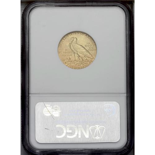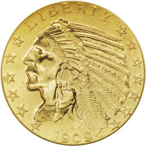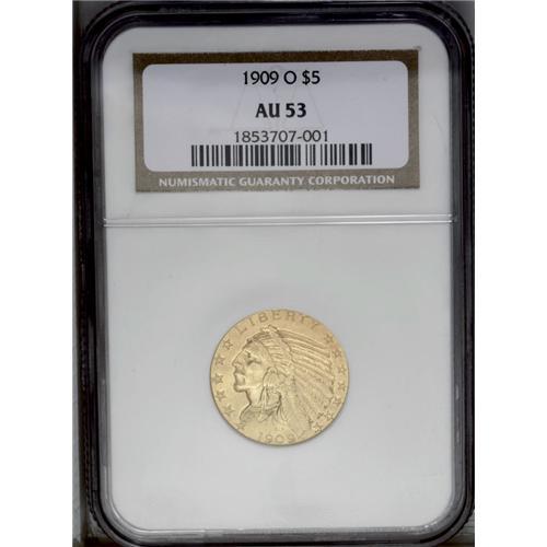 <B>1909-O $5 AU53 NGC.</B></I> The 1909-O has the lowest mintage of any business strike Indian half eagle, and is also the key to the series in Mint State. This briefly circulated tan-gray example shows rub on the cheekbone, headdress, and wing, but luster emerges from the profile and plumage. Minor marks on the cheekbone and the rim at 8:30 are barely worthy of mention.<BR><BR><b>Shipping:</b> Coin/Currency (<a target="_blank" href="http://www.heritageauctions.com/common/shipping.php">view shipping information</a>)