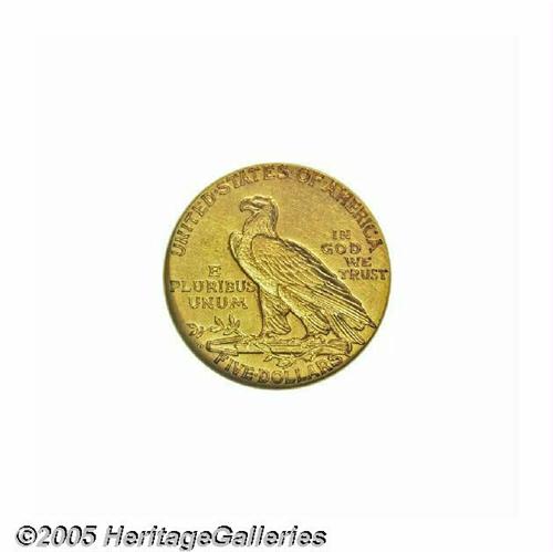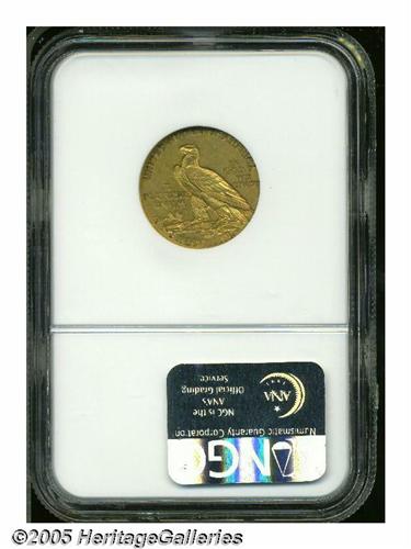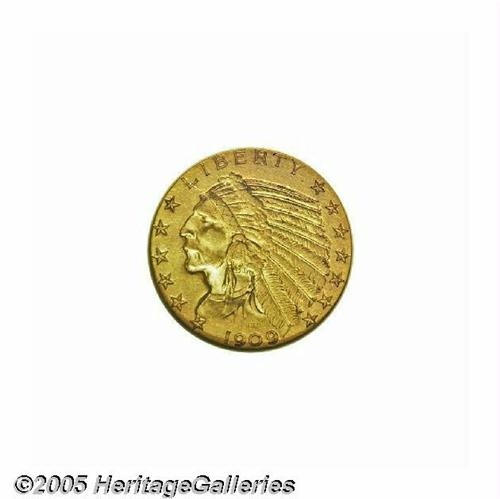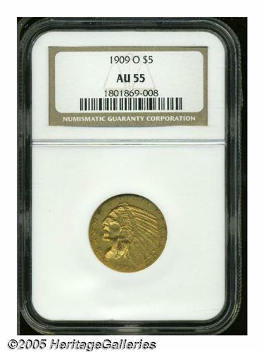 <B>1909-O<$5> AU55 NGC.</B></I> With an original mintage of just 34,200 pieces, the 1909-O carries the designation of having the lowest original mintage in the series and is the premier rarity among Indian half eagles. While the '09-O is often seen weakly struck, this piece is uncommonly well-defined, with the all-important "O" mintmark clear and relatively strong. The surfaces display an orange-gold patina, and just a few small abrasions scattered about.