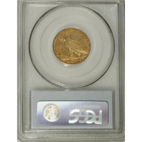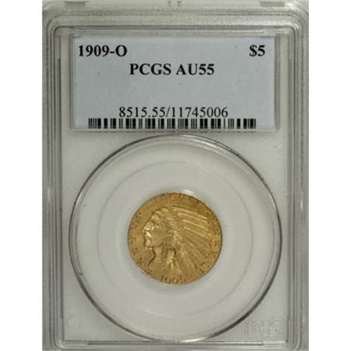 <B>1909-O $5 AU55 PCGS.</B></I> The final issue of New Orleans gold, the 1909-O also happens to be one of two keys to the Indian half eagle series. The mintage of 34,200 pieces has left too few survivors to satisfy collector demand, and this issue remains the single most expensive piece to acquire in Mint State grades. The collector who opts not to acquire an Uncirculated example could try for a pleasing AU piece such as the present coin instead. This dusky orange-gold representative offers pleasing detail, subtle luster, and only a trace of wear across the surfaces. <BR><BR><B>Coin Engraver:</B> Bela Lyon Pratt<BR><BR><b>Shipping:</b> Coins & Currency (<a target="_blank" href="http://www.heritageauctions.com/common/shipping.php">view shipping information</a>\)