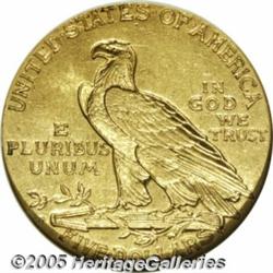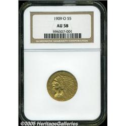 <B>1909-O $5 AU58 NGC.</B></I> The key feature on this coin is the mintmark. In this case, it is well defined and readily visible, unlike the "blob" mintmarks that are often seen. Both sides of this coin are well struck, even on the eagle's shoulder where most of the feathers are visible. The surfaces are slightly subdued and a number of abrasions are seen on the reverse side. Scarce in all grades, especially in AU and better conditions.
