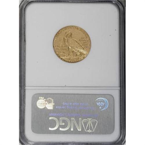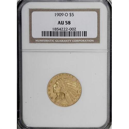 <B>1909-O $5 AU58 NGC.</B></I> The 1909-O half eagle is the final gold coin produced at the New Orleans Mint, and is the only Indian Head five dollar to be struck at this mint. It is one of the most sought-after issues in the Indian Head five dollar series because of its low mintage (34,200 pieces, the lowest in the series), and its general rarity in any Mint State grade. Douglas Winter writes in his <I>Gold Coins of the New Orleans Mint</B></I>, that: "Examples in VF and EF grades are readily available. Attractive AU coins are fairly scarce and most graded as such by NGC and PCGS are low end pieces with poor eye appeal."<BR> This high-end AU example displays ample luster residing on yellow-gold surfaces. A better-than-average strike occurs on the design features; indeed, the only element that is weak is the mintmark, which is typical for the issue. The few light marks we see are not out of context for a coin that has seen limited circulation. All in all, a pleasing example of this key-date specimen.<BR><BR><B>Coin Engraver:</B> Bela Lyon Pratt<BR><BR><b>Shipping:</b> Coins & Currency (<a target="_blank" href="http://www.heritageauctions.com/common/shipping.php">view shipping information</a>\)
