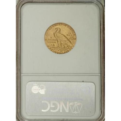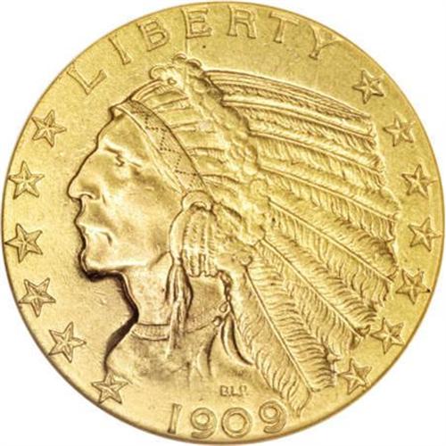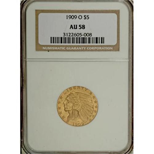 <B>1909-O $5 AU58 NGC.</B></I> Variety Two. Unlike Variety One, the mintmark is sharply punched and shows no signs of doubling. This is the scarcer of the two varieties. The 1909-O has the lowest mintage figure of any issue in the Indian Head five dollar series (34,200 pieces). <BR> David Akers, in his cataloging of the 1909-O half eagle in the May 1998 Dr. Thaine Price Collection, indicates that "... most of them were obviously put into circulation since the majority of known examples are in the VF to EF range; even AU specimens are very scarce, if not rare. In Mint State, the 1909-O is very rare and only a few such specimens exist ... ."<BR> This AU58 example displays considerable luster on its honey-gold surfaces. An attentive strike imparts better definition than ordinarily seen, especially on the typically soft bonnet feathers and the eagle's leg plumage. Another favorable attribute is that the coin is quite clean, whereas the vast majority have heavily abraded surfaces (Douglas Winter, 2006).<BR><I>From the January 1991 Stack's sale, lot 1425, flip included</B></I>.<BR><I>From The John Stimson, Sr. Collection, Part One.</B></I><BR><BR><B>Coin Engraver:</B> Bela Lyon Pratt<BR><BR><b>Shipping:</b> Coins & Currency (<a target="_blank" href="http://www.heritageauctions.com/common/shipping.php">view shipping information</a>)