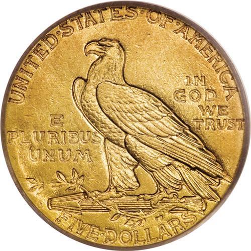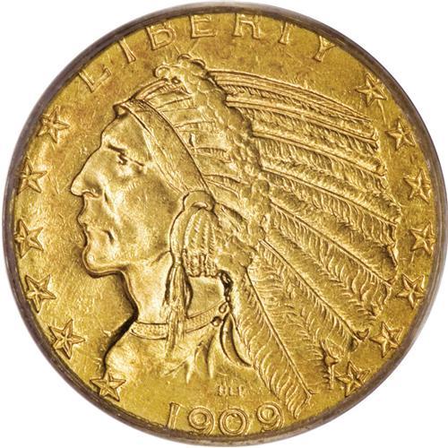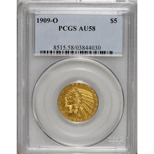 <B>1909-O $5 AU58 PCGS.</B></I> A product of the final year of operations for the New Orleans Mint and the only example of this design in either the quarter eagle or half eagle denominations, this date is one of the rarest and most important in the entire 20th century half eagle series. The mintage was a mere 34,200 coins with most survivors in grades below this piece. It is a sharply impressed example with highly lustrous yellow and orange-gold surfaces that are free of any distracting marks. The mintmark is boldly visible as it is on most examples.<BR><BR><b>Shipping:</b> Coins & Currency (<a target="_blank" href="http://www.heritageauctions.com/common/shipping.php">view shipping information</a>)