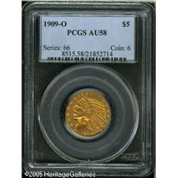 <B>1909-O $5 AU58 PCGS.</B></I> The only New Orleans issue in the series of Indian Half Eagles and a scarcity in all grades from a small mintage of just 34,200 pieces. This Borderline Uncirculated example is better detailed than most 1909-O Fives and is layered in appealing, medium, golden-orange patina. There are only a few small marks and abrasions on either side. Lot:8684