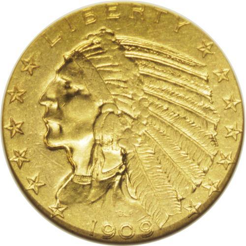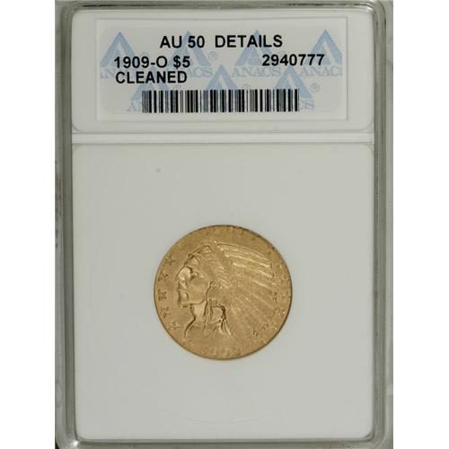 <B>1909-O $5 --Cleaned--ANACS. AU50 Details.</B></I> A near-match to another 1909-O coin in this sale, also attractive despite a light old cleaning, with a few less surface abrasions for the details grade. Honey-gold surfaces. The mintmark is again faint.<BR><I>From The Twin Hollows Collection, Part Two.</B></I><BR><BR><b>Shipping:</b> Coins & Currency (<a target="_blank" href="http://www.heritageauctions.com/common/shipping.php">view shipping information</a>)