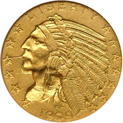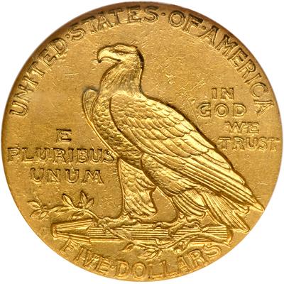 1909-O $5 Indian. NGC graded AU-55. Scarce date. There is a slight indentation in the field from the thrd star to the Indian's face; otherwise smooth surfaces abound on this key date Indian five, the one and only issue from the New Orleans Mint. Only 34,200 pieces struck. Pop 169 (PCGS # 8515).