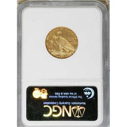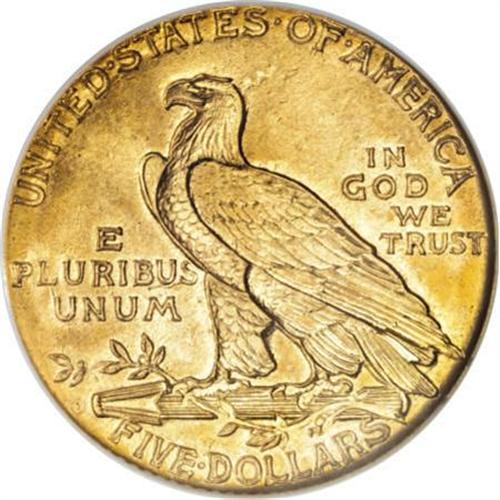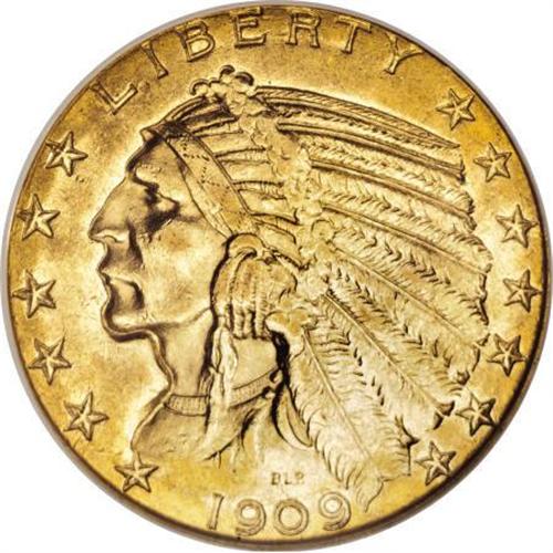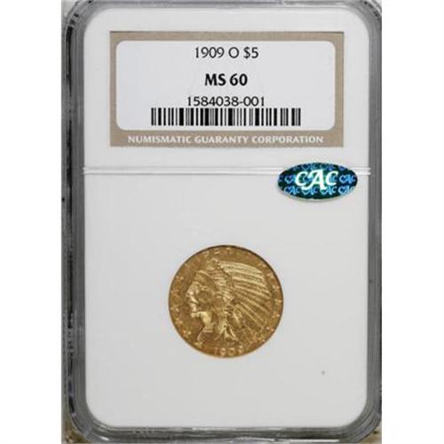 <B>1909-O $5 MS60 NGC. CAC.</B></I> Not only is the 1909-O scarce in the absolute sense because of the low mintage, but it is also a conditional rarity with very few examples known above the AU level. This is a particularly attractive piece that shows rich reddish patina around the margins and bright yellow-gold centers. Well, but not fully struck, as always seen on this issue. The most notable areas of weakness are at the bottom of the headdress and top of the eagle's wing. A number of small to medium-sized marks are scattered over each side, none of which deserve individual mention.<BR><BR><B>Coin Engraver:</B> Bela Lyon Pratt<BR><BR><b>Shipping:</b> Coins & Currency (<a target="_blank" href="http://www.heritageauctions.com/common/shipping.php">view shipping information</a>)