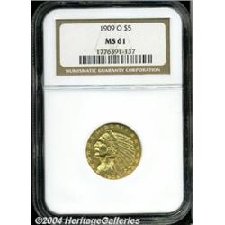 <B>1909-O<$5> MS61 NGC.</B></I> The 1909-O is widely recognized as the key to the Indian half eagle series and it is one issue that cannot be acquired in Uncirculated grades on demand. Only 34,200 pieces were produced, and the typical coin is weakly struck and in VF-XF condition. This is an especially impressive example that is sharply defined throughout, including the mintmark. Medium orange-gold coloration throughout with numerous small, but individually insignificant abrasions.<BR><I>From The Sarasota Collection.</B></I> <BR><BR><B>Important notice:</B> Heritage usually auctions material at the rate of 200-250 lots per hour. On some occasions eBay Live bid software or the Internet may not be able to keep up with the pace of the auction. We recommend placing a realistic absentee bid now as insurance to avoid disappointment. Occasionally the auctioneer may eliminate or reject an eBay Live bid, and the auctioneer may also reopen a lot after the close of the eBay live bidding (usually because we missed an audience bid), and may reject your bid even if it shows you as the winning bidder. By bidding via eBay Live, you agree that Heritage may award the lot to another bidder at its sole discretion under the circumstances described above or any other reasonable circumstances. Since eBay bids are not shown to us until we open the lot on the floor, we treat those bids just like floor bids. In most cases the floor responds before the eBay bid is presented to us, due to Internet lag time, so for consistency we have made it a policy that floor bids are always considered first over tie eBay live bids. Also please note that all Heritage lots purchased through eBay Live carry a 20% Buyer's Premium. Please make sure you read the Terms and Conditions before you bid. </span></font></tr></table></td></tr></table>