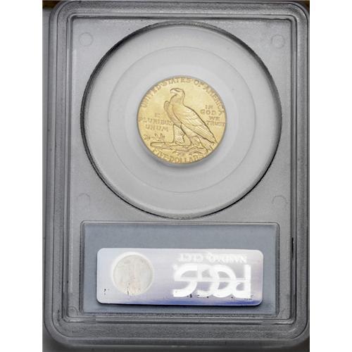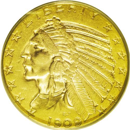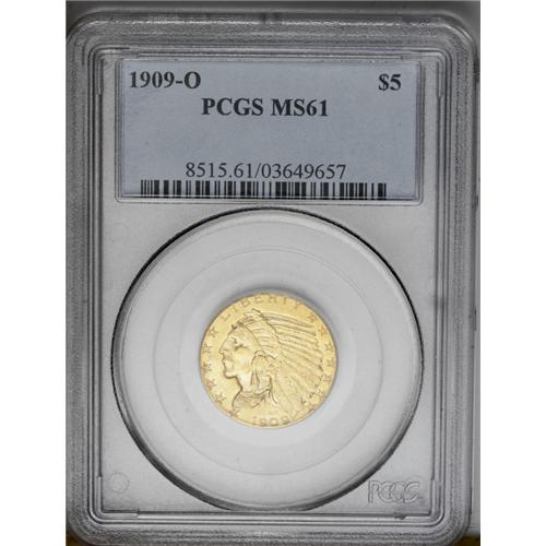 <B>1909-O<$5> MS61 PCGS.</B></I> The coinage history of the New Orleans Mint spanned 55 years from 1838 to 1861 and again from 1879 to 1909. During the final year of its history, the three Barber silver denominations were produced alongside the half eagle, but no other coinage. The building remains standing today, surviving the recent hurricane Katrina with only minor damage. The building easily ranks among the oldest buildings in Louisiana, but it is still a relatively new structure in the French Quarter.<BR> Without a doubt, this is the rarest date in the Indian half eagle series, and also the <I>only</B></I> New Orleans Mint issue of the Indian design gold coinage, regardless of the denomination. Only 34,500 examples of this date were coined, which was the lowest mintage of any Indian half eagle. David Akers ranked this as the rarest date in all Mint State grades, and the third rarest in MS64 or finer grades behind the 1911-D and 1914-S issues. This is a pleasing example with faint rose-colored gold surfaces and satiny luster. It is sharply struck, including a fully distinct mintmark. Population: 14 in 61, 55 finer (6/06).