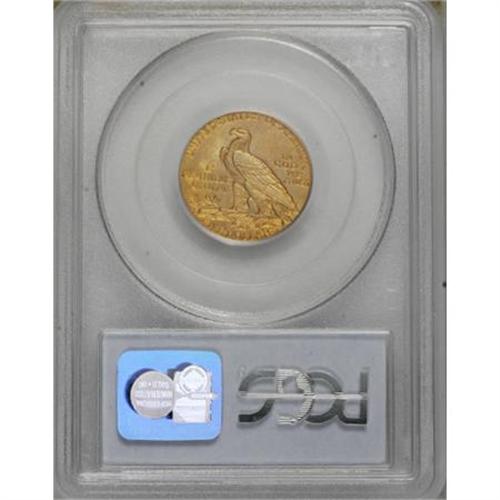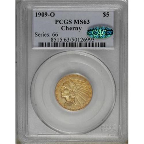 <B>1909-O $5 MS63 PCGS. CAC.</B></I> Ex: Cherny. Variety One: The mintmark is weakly impressed and shows doubling on its left side. In 1909 the New Orleans Mint, not having struck a half eagle since 1894 nor a gold coin of any other denomination since 1906, struck a small quantity of half eagles: 34,200 pieces to be precise, making the issue the only O-mint Indian Head half eagle. That was not only the last gasp of the New Orleans Mint, whose fate had been sealed for several years since the new Denver Mint came online in 1906, but it was also the last O-mint gold coinage. The paltry mintage of 34,200 1909-O half eagles must have appeared especially insignificant next to the gargantuan emission of half eagles in 1909 from the Denver Mint, amounting to more than <I>3.4 million</B></I> examples! <BR> Although it is conditionally rare and one of several issues in the series that are elusive in the higher Mint State grades, the 1909-O thus bears a special allure "due to its status as a one-year type," as Douglas Winter puts it in <I>Gold Coins of the New Orleans Mint: 1839-1909. </B></I>The issue appears to have gone directly into circulation with little notice or fanfare, as the typical piece encountered today grades just AU or Choice AU. The present lot is one of only seven examples MS63 graded at PCGS, with 13 finer (3/08). As always, those population figures are almost certainly artificially augmented by resubmissions.<BR> While most 1909-O fives seem to have rather unattractive patination, the Select piece offered here displays outstanding color characteristics--a blend of pretty orange-gold and mint-green. The luster is also pleasing, again unusual for the issue. Strike can be a problem on Mint State coins, especially on the lower feathers of the headdress and on the eagle's legs. The present coin is above average in those areas as well. The only hint of minor softness occurs on the mintmark, which is typical for the variety, and on the eagle's shoulder, but even there, all feather detail is visible. A few minute marks on the Indian's cheek and on the raised, exposed fields, especially on the reverse, preclude an even higher grade. Overall, a great representative of this key issue.<BR><BR><B>Coin Engraver:</B> Bela Lyon Pratt<BR><BR><b>Shipping:</b> Coins & Currency (<a target="_blank" href="http://www.heritageauctions.com/common/shipping.php">view shipping information</a>)